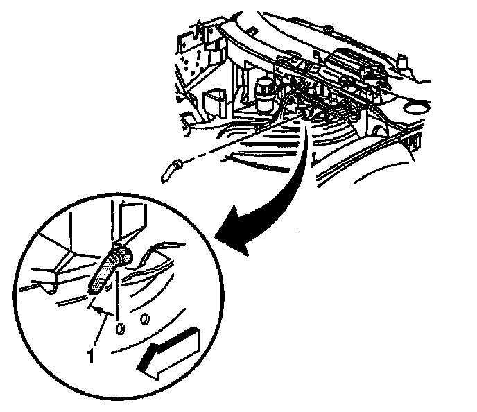 32. Install the evaporator and HVAC module drain tube to the module; orientate the drain tube to contact the dash panel as shown (1).