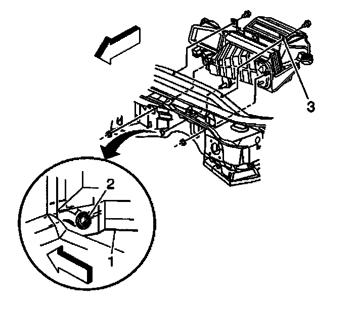 The opening in the dashmat for the HVAC module drain should be aligned so that the drain opening in the dash panel is approximately centered in the dash mat opening; allowing ample room for the module drain seal (2) to fully seat against the dash panel.