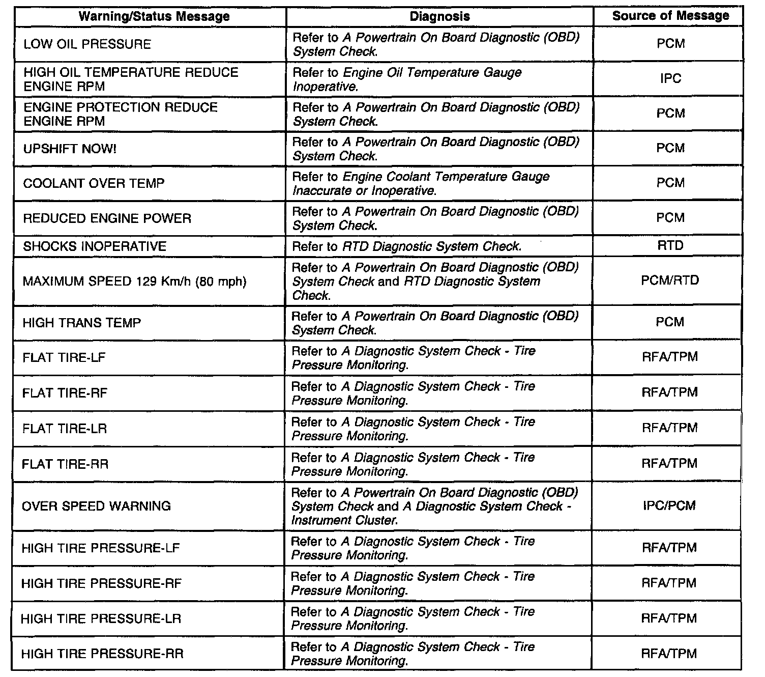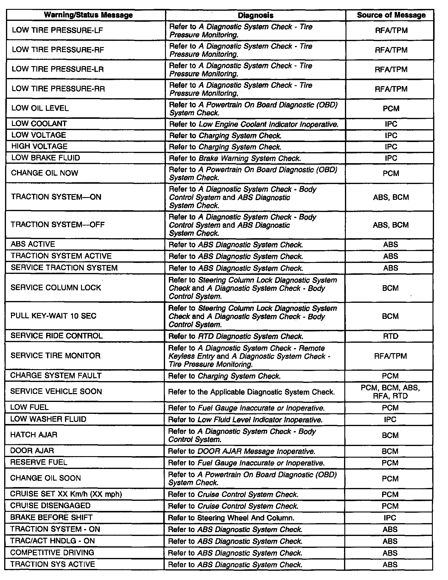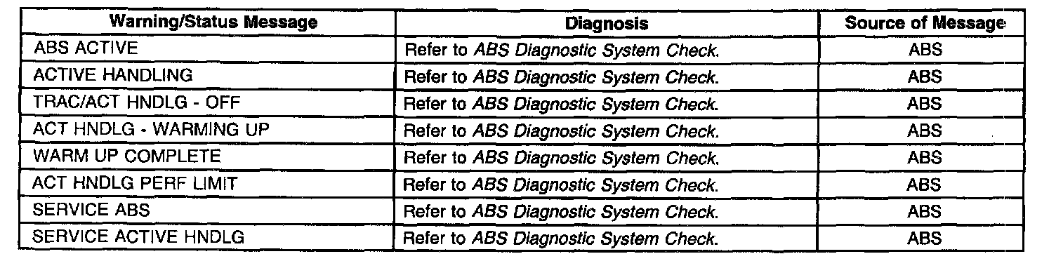 The Instrument Panel Cluster (IPC) is equipped with a 20 character vacuum fluorescent display feature. This feature provides the driver with specific warning/status messages associated with certain vehicle malfunctions and/or instructions to perform. Warning messages are displayed in a ranked priority, with the higher priority messages (priority 1) displayed first. If the ignition is cycled, the IPC will display the last message before the ignition was cycled. Many messages coincide with indicators and Diagnostic Trouble Codes (DTCs) that may be set. DTCs must always be diagnosed first prior to diagnosing any warning messages. Unlike other vehicle electronic systems, such as PCM, SIR, etc., some systems have no specific ERROR lamp to indicate a malfunction. A DTC-setting malfunction in any system connected to the serial data line may be indicated by a specific message displayed in the IPCs display. Other system malfunctions will only set a DTC and will not display a message. Refer to the appropriate system diagnosis for a description on how each DTC set and how it will be indicated. Warning messages will be displayed in all display modes except configuration and Diagnostic modes. When a warning message is displayed, the message overwrites any current displays. The IPC will continue to display this message until the system that requested the message sends a Stop Broadcasting Message on the serial data line to the IPC. Warning message may also be acknowledged/cleared by pressing the RESET button when that message is displayed except if a system requests a continuous message display. The table indicates possible messages that may be displayed by the IPC and what system is responsible for sending the request.