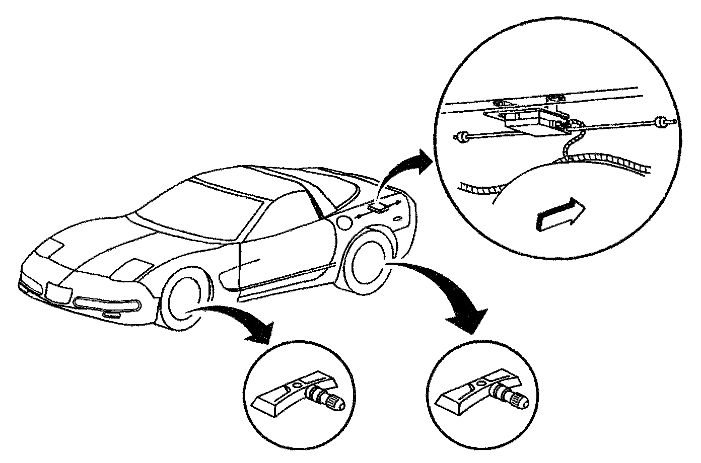 The TPM system consists of four battery powered, water resistant, radio frequency signal generator sensors and a receiver with self diagnostic capabilities. A sensor is mounted on each wheel on the back of each valve stem. The valve stem and the sensor battery are integrated and are not serviceable. The receiver is located over the LH rear wheelhouse. The TPM system uses the same receiver as the RFA system. Refer to Remote Keyless Entry System Description in Keyless Entry, for additional information on the RFA system.