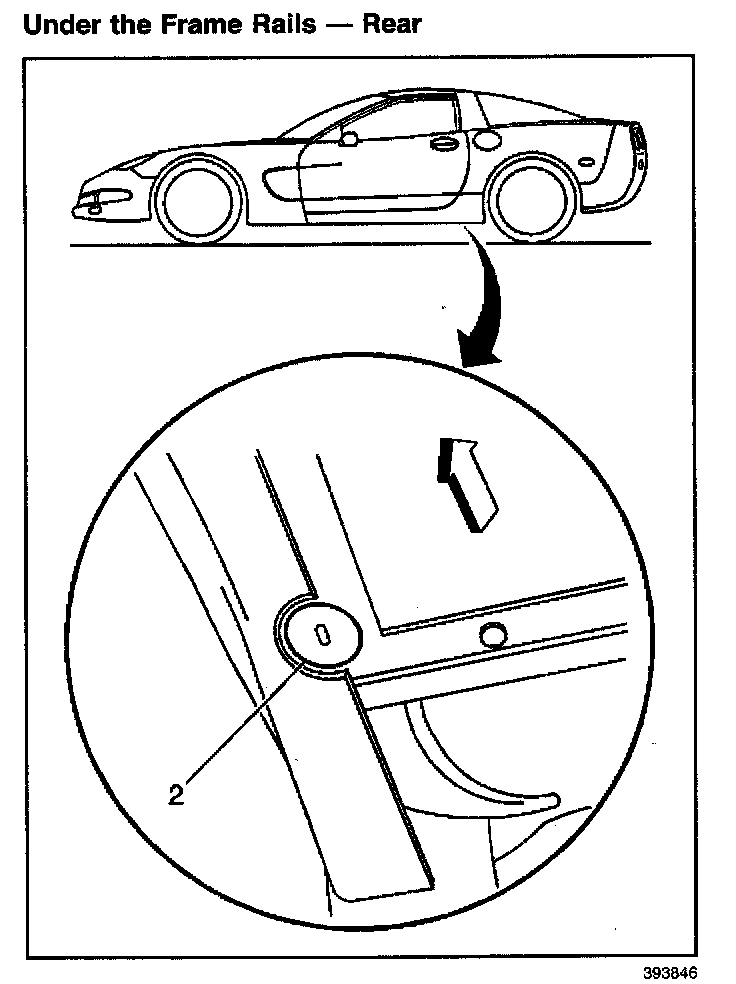 IMPORTANT: Use only service jacks utilizing 64 mm (2 1/2 inch) or smaller diameter lifting pads, to reduce the possibility of contact with undesired areas of the vehicle:Under The Front Rails Rear: