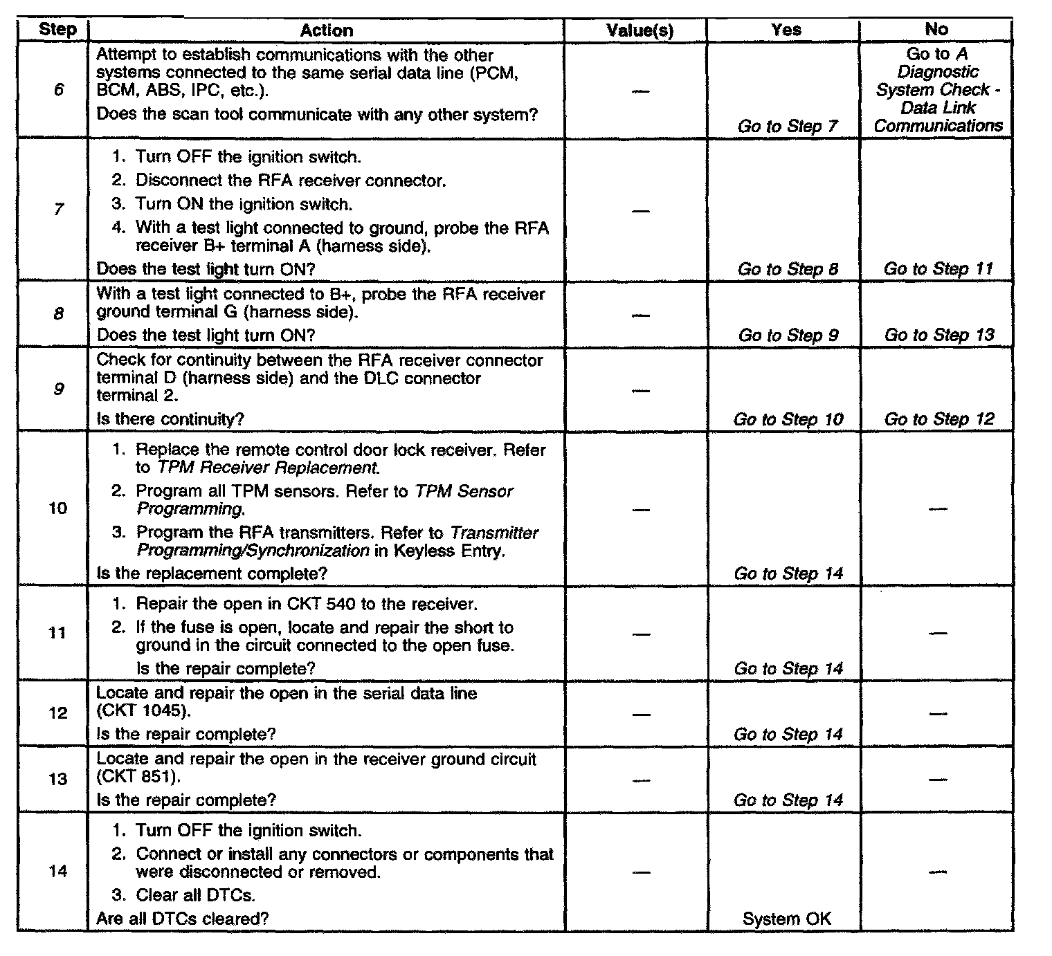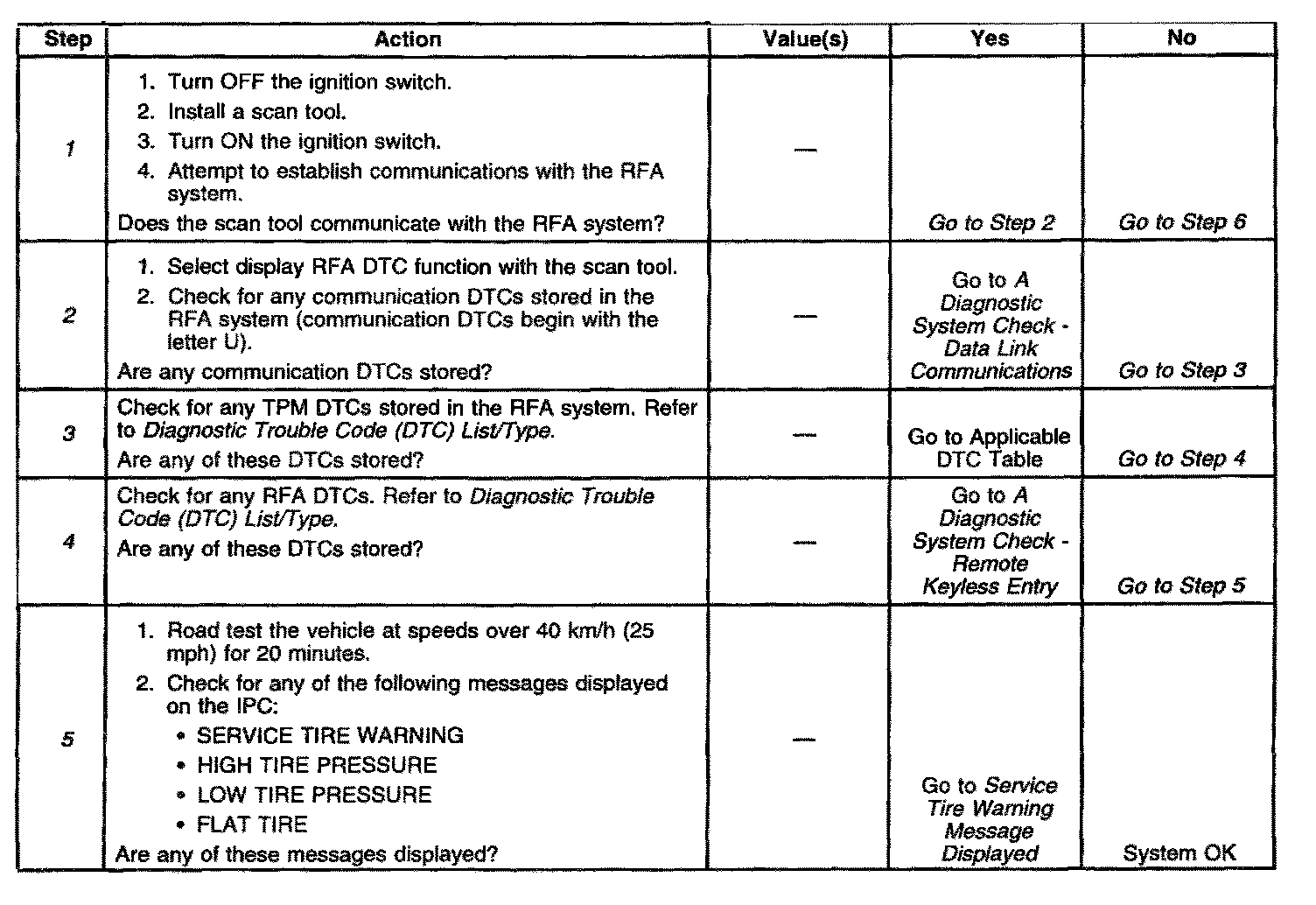 4. This test checks for any RFA system DTCs stored in the receiver's memory. Some DTCs that are associated with the RFA system may cause a TPM system malfunction. Always diagnosis any RFA DTCs that are stored.
