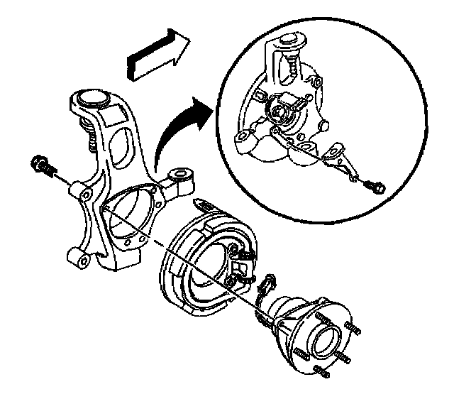 NOTICE: The Front and Rear Wheel Hub/Wheel Speed Sensors are not interchangeable. When you are replacing a Wheel Hub/Wheel Speed Sensor be sure to use the correct Wheel Hub/Wheel Speed Sensor part number. Do not mount the Rear Wheel Hub/Wheel Speed Sensor in the front steering knuckle. The Rear Wheel Hub/Wheel Speed Sensor features a splined hole through the center of the bearing which mates to the drive axle. The Rear Wheel Hub/Wheel Speed Sensor requires the support of the drive axle and the drive axle nut clamped joint to properly carry the vehicle loads. Mounting the Rear Wheel Hub/Wheel Speed Sensor in the front steering knuckle can cause bearing failure and possible damage to the vehicle.
