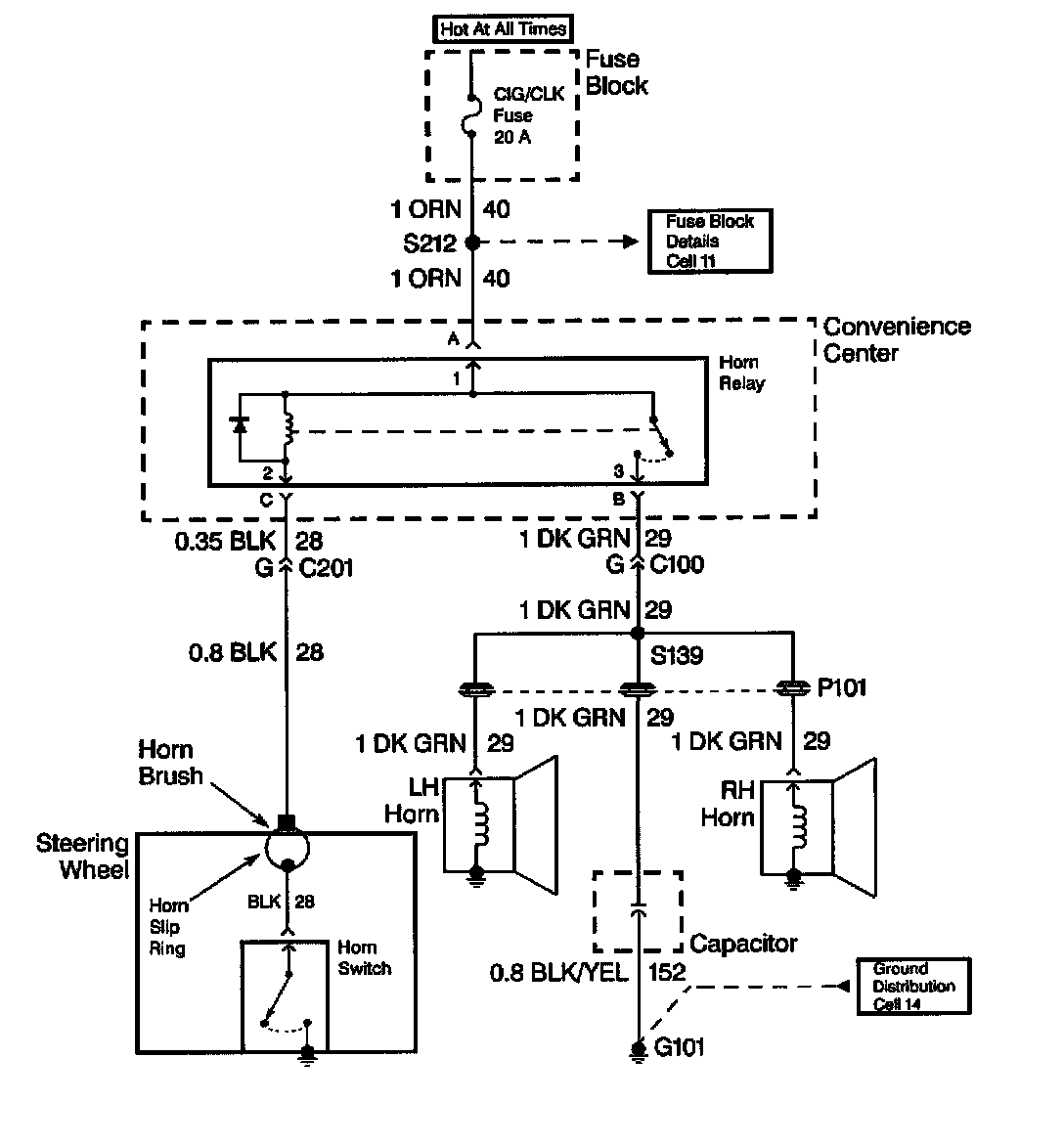 IMPORTANT: The schematic does not represent the components and wiring as they physically appear on the vehicle. For example, a 4-foot length of wire is treated no differently in a schematic from one which is only a few inches long.When diagnosing a horn problem use the service information located in the Horns service category. The following schematic is a typical example of a schematic with its supporting text.