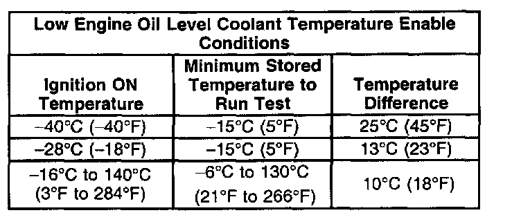 ^ If the PCM determines the Ignition ON engine coolant temperature is cooler then Ignition OFF engine coolant temperature by a predetermined amount, the PCM tests the Engine Oil Level sensor circuit. The table illustrates the required temperatures to enable the Engine Oil Level test.