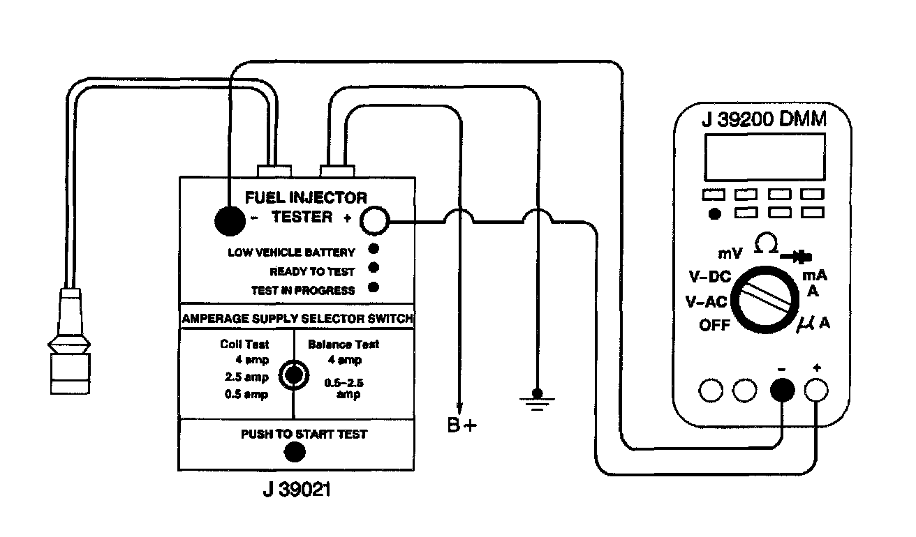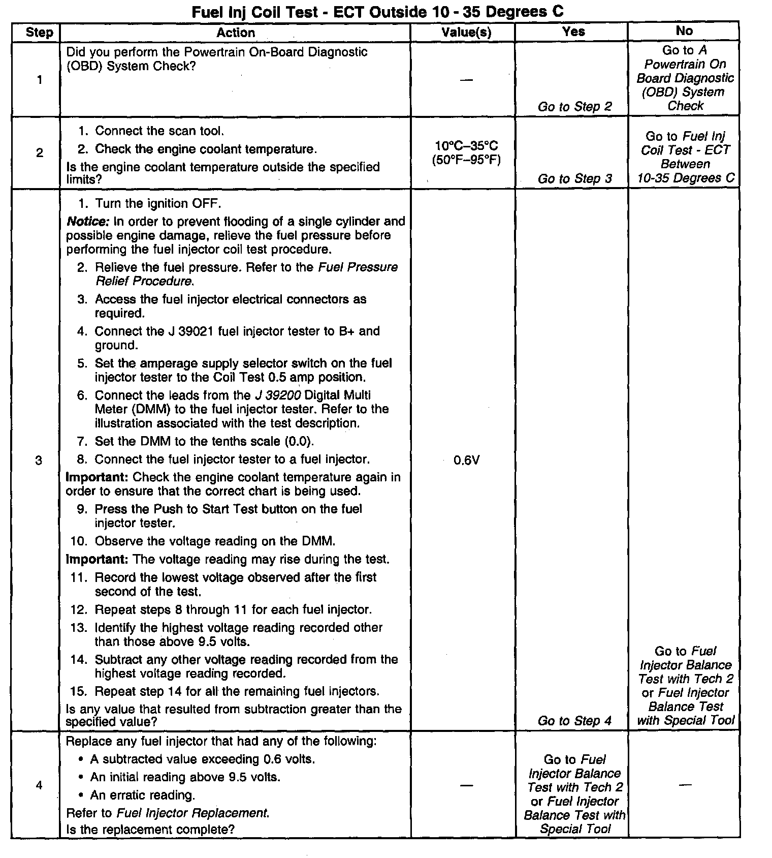 2. The engine coolant temperature affects the ability of the fuel injector tester to detect a faulty fuel injector. If the engine coolant temperature is between 10 °C-35 °C (50 °F-95 °F), go to Fuel Inj Coil Test - ECT Between 10-35 Degrees C.