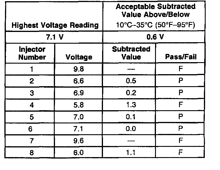 3. The first second of the voltage displayed by the DMM may be inaccurate due to the initial current surge. Therefore, record the lowest voltage displayed by the DMM after the first second of the test. The voltage displayed by the DMM may increase throughout the test as the fuel injector windings warm and the resistance of the fuel injector windings changes. An erratic voltage reading (large fluctuations in voltage that do not stabilize) indicates an intermittent connection within the fuel injector. From the voltages recorded, identify the highest voltage, excluding any voltages above 9.5 volts. Subtract each voltage that is not above 9.5 volts from the highest voltage. Record each subtracted value (refer to the Example). The subtracted value for any fuel injector must not exceed 0.6 volt. A fuel injector with a subtracted value that is greater than 0.6 volt is faulty. Replace the fuel injector. A fuel injector with a recorded voltage above 9.5 volts is also faulty. Replace the fuel injector.