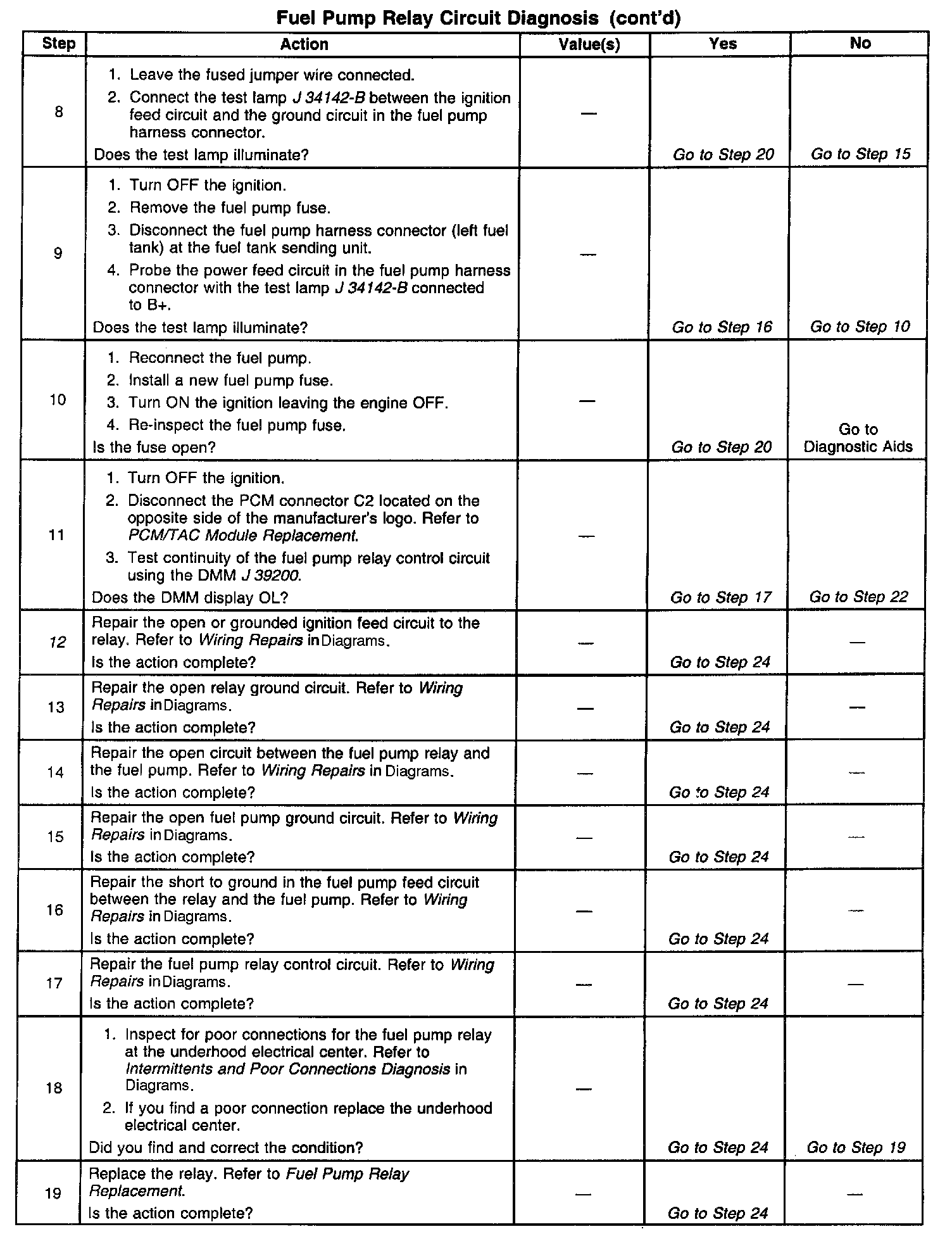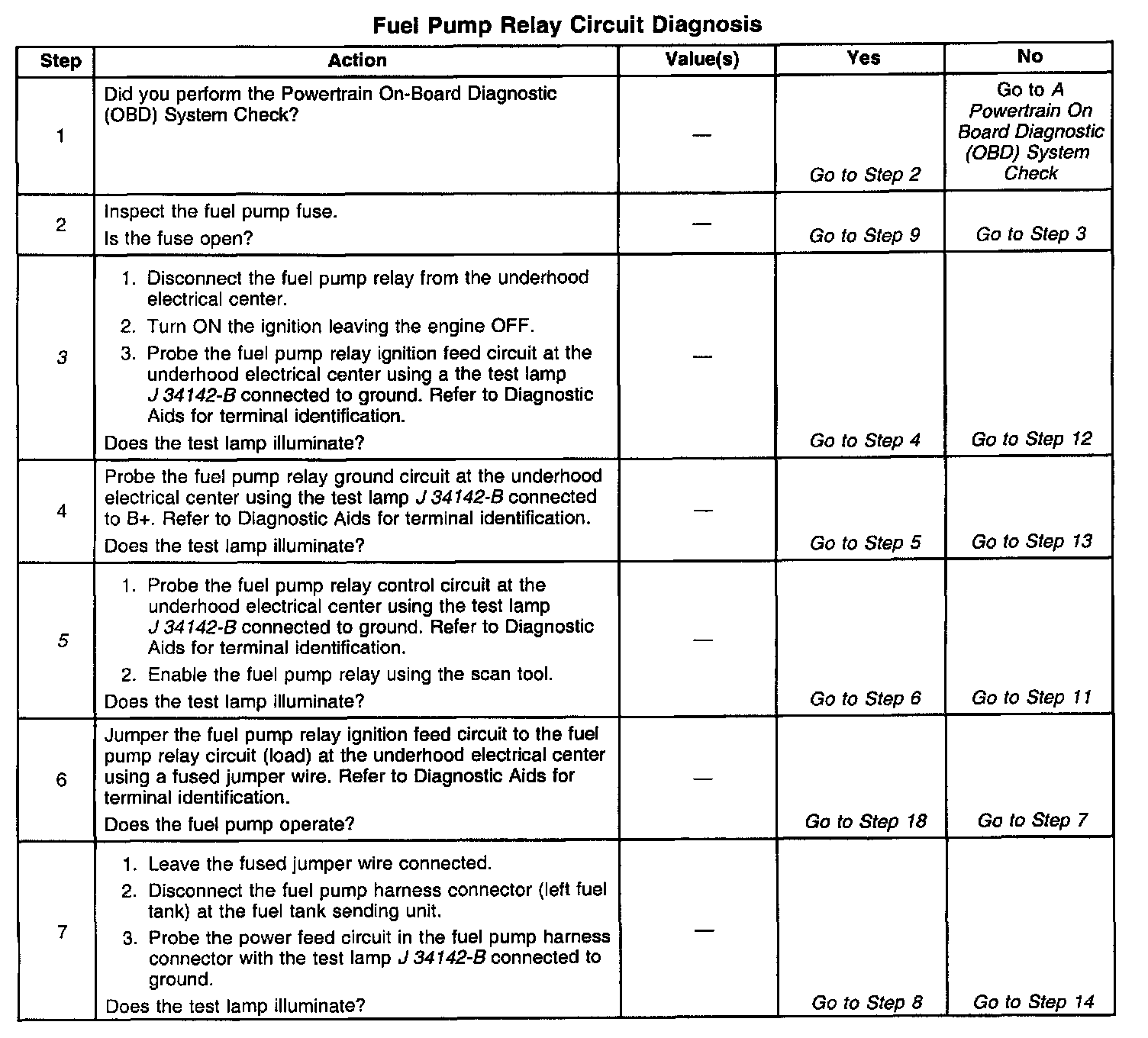 3. This step test the fuel pump relay ignition feed circuit. For relay terminal identification, refer to the table in the Diagnostic Aids.