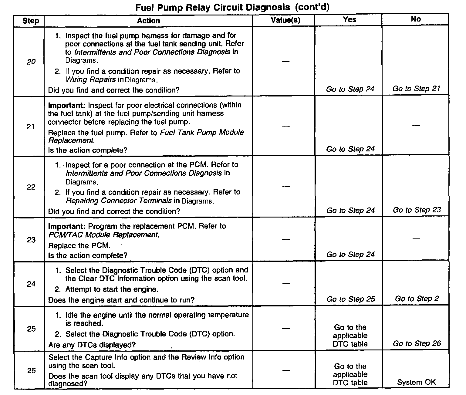 20. Inspect the fuel pump fuse for an open. If the fuse is open, test the circuit for a short to ground.