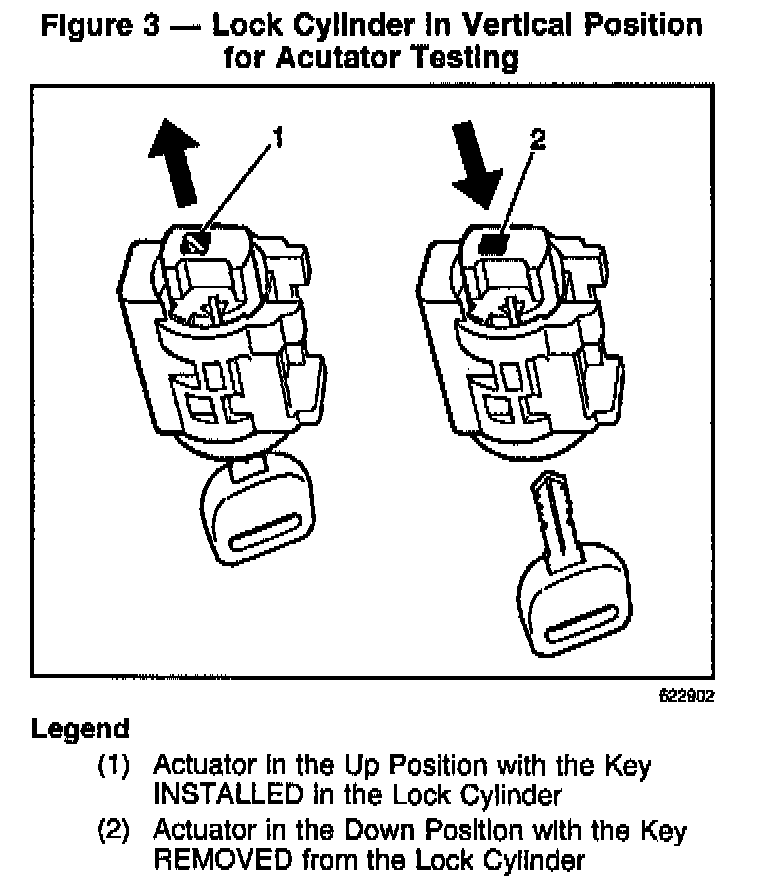 3. If the EARLY design actuator in the lock cylinder DOES drop down, replace the actuator with the new design actuator P/N 12450483.