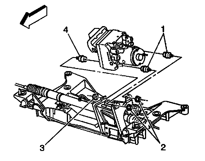 3. Remove the Electronic Brake Control Module/Brake Pressure Modulator Valve (EBTCM/BPMV) (4) and bracket. Refer to Brake Pressure Modulator Valve Bracket Replacement in Antilock Brake System.
