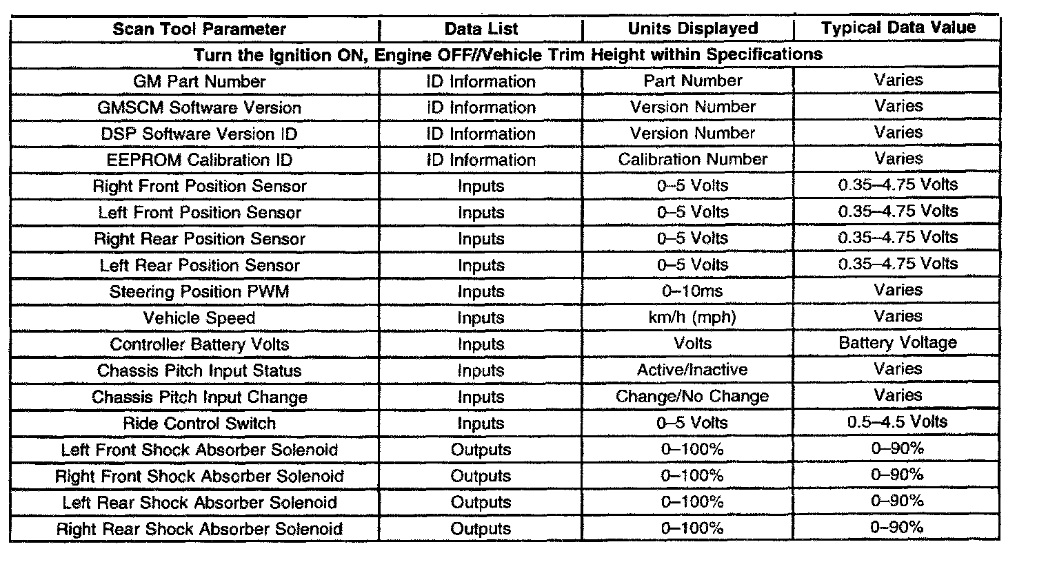 A scan tool must be used in diagnosing system malfunctions before removing or replacing any of the components. Become familiar with the scan tool diagnostic capabilities and thoroughly understand each of the diagnostic features described before attempting any diagnostic procedures. The scan tool is capable of displaying data and input/output information from all of the systems connected to the serial data line. The scan tool is also capable of commanding the shock absorbers ON or OFF without the need for any input information.DATA DISPLAY