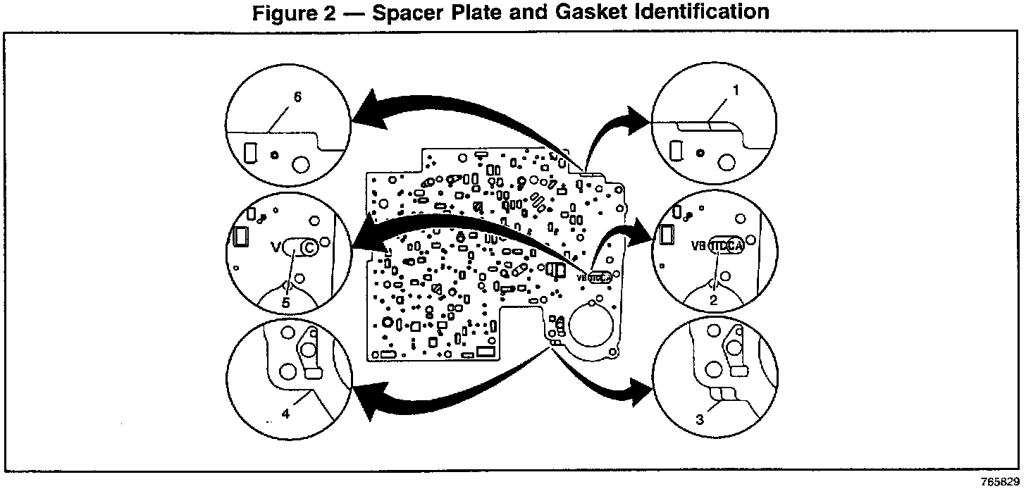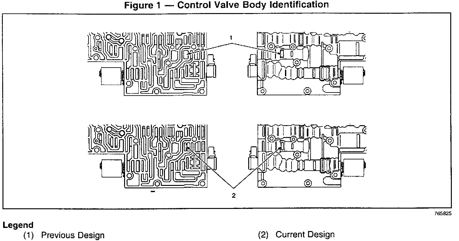 Starting with 4L60-E transmissions built after Julian date 1002, the valve body (350), spacer plate (48), and valve body gaskets (47 and 52) have been changed due to full annular port exhaust on the TCC regulator valve (380). Figure 1, item 1, shows the affected area prior to the valve body change, and Figure 1, item 2, shows the changed area on the new valve body. Figure 2 shows how to identify the previous gaskets and spacer plate vs. the new gaskets and spacer plate. These revised parts will back service all 1998-2001, 4L60-E transmissions M30 and M32.