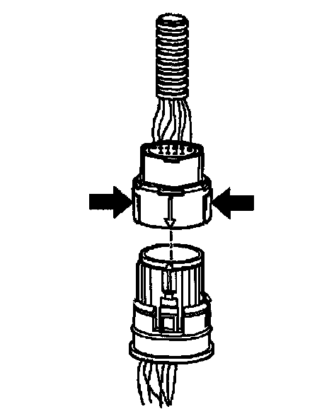 ^ In order to reinstall the external wiring connector, first orient the pins by lining up the arrows on each half of the connector. Push the connector straight down into the transmission without twisting or angling the mating parts.
