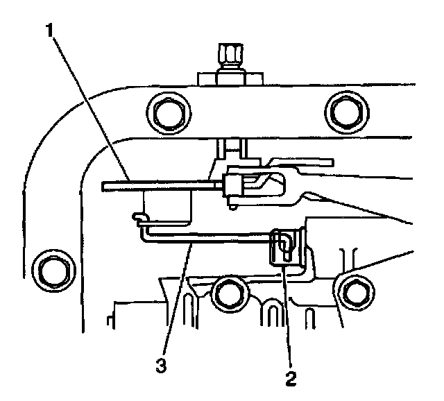 2. Verify that the manual valve link (3) is installed properly to the inside detent lever (1) and the manual valve (2).