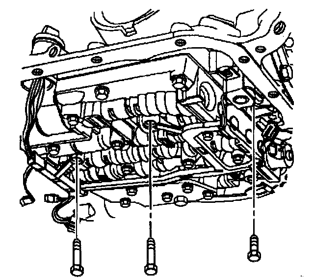 6. Remove the TCC solenoid retaining bolts and the valve body bolts which retain the internal wiring harness.