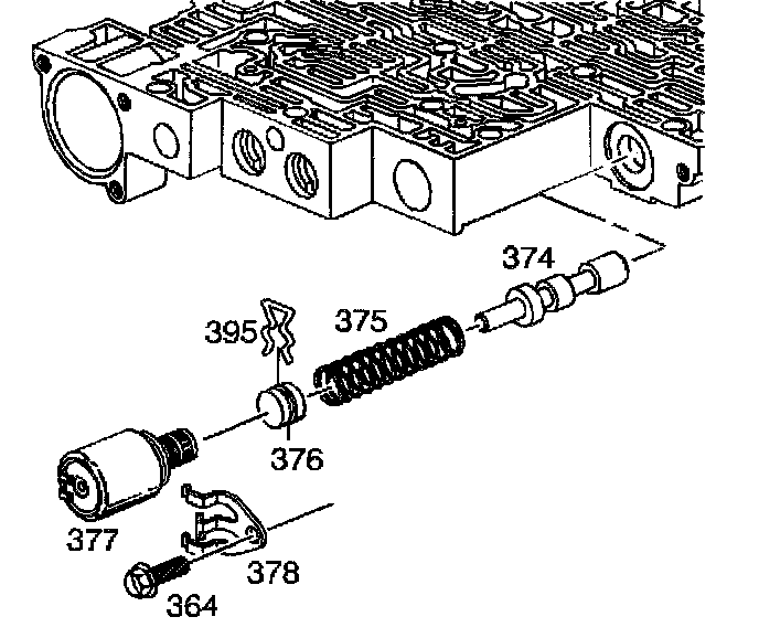 14. Remove the solenoid retainer bolt (364) and the solenoid retainer (378). Remove the pressure control solenoid (377).