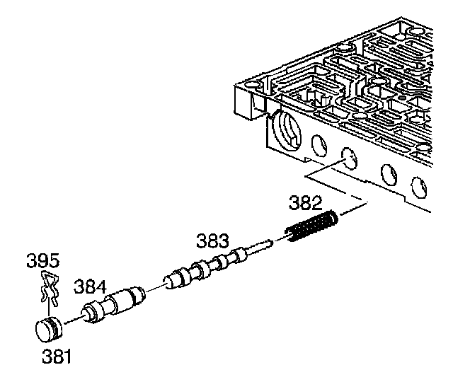 30. Remove the 3-4 relay valve (384) and the 4-3 sequence valve (383) and the 4-3 sequence valve spring (382).
