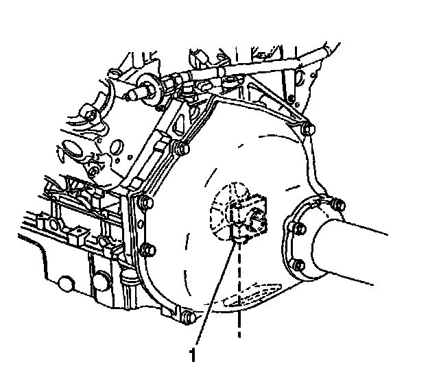 54. Carefully pull the wiring harness down into the L-shaped brackets along the driveline support assembly, align the harness retainer (locator) (1) to the hole in the forward bracket, then secure in place.