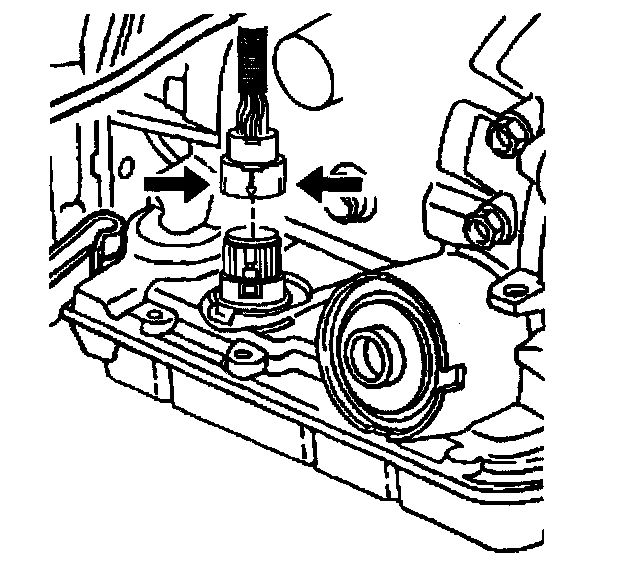 43. Disconnect the transmission harness 20-way connector. Depress both tabs on the connector and pull straight up; do not pry the connector.