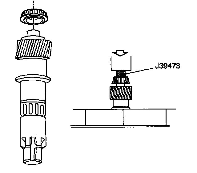 1. Install a new small tapered bearing, using the J 39473, V-blocks, and a hydraulic press.