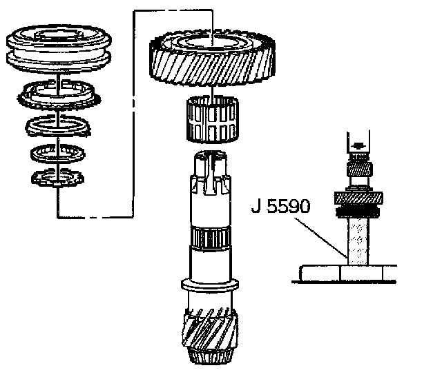 3.7. The 5th/6th speed synchronizer assembly (The Inside Diameter (ID) groove on the sleeve faces 5th speed gear.) Use the J 5590 and a hydraulic press