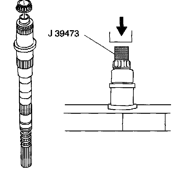 6. Install a new mainshaft small tapered bearing, using the J 39473, V-blocks, and a hydraulic press.