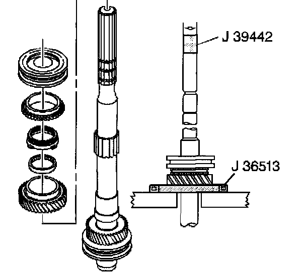 8. Remove the 2nd speed gear (The 1st/2nd speed synchronizer assembly, the 2nd speed gear blocking ring, the 2nd speed gear friction cone, and the 2nd speed gear inner cone will press off with the 2nd speed gear). Use the J 36513 in an inverted position, J 39442 and a hydraulic press.
