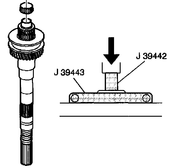10. Remove the mainshaft small tapered bearing. Use the J 39442, the J 39443, and a hydraulic press.