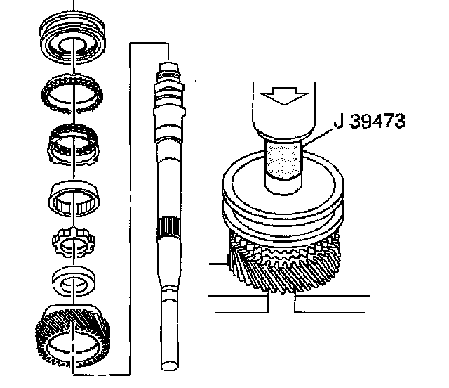 14. Use the J 39473, V-blocks, and a hydraulic press to remove the 3rd speed gear (The 3rd/4th speed synchronizer assembly, the 3rd speed gear blocking ring, the 3rd speed gear friction cone, the 3rd speed gear inner cone, thrust washer, and spacer will press off with the 3rd speed gear).