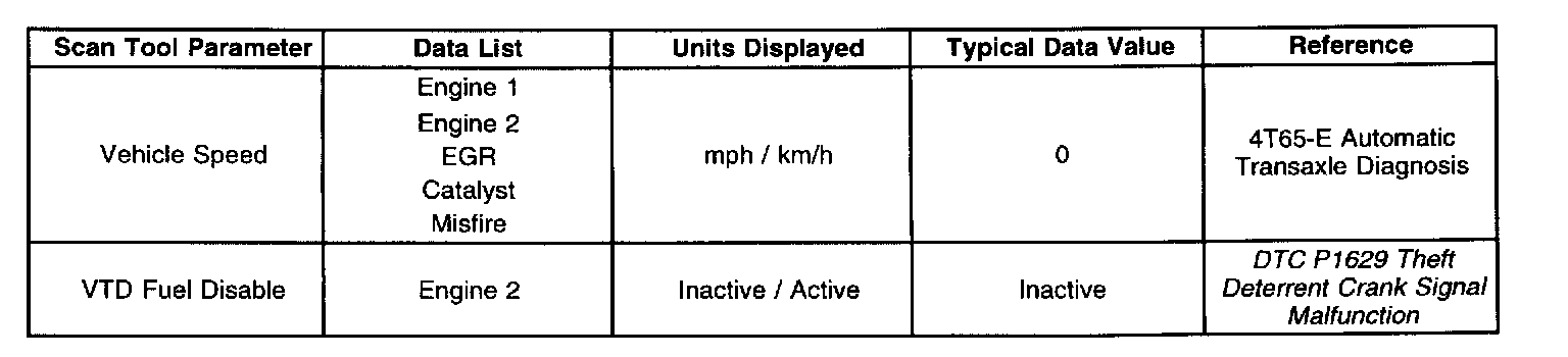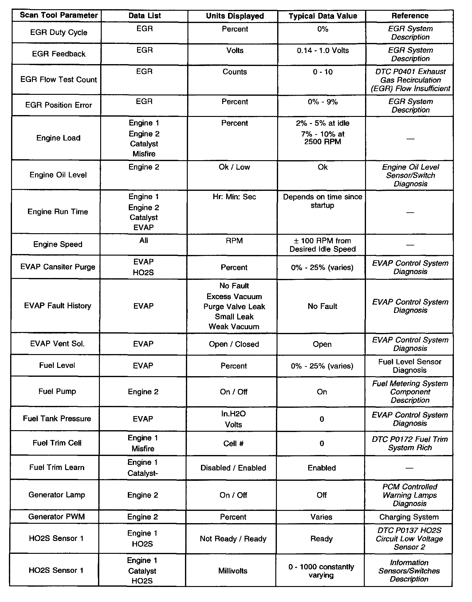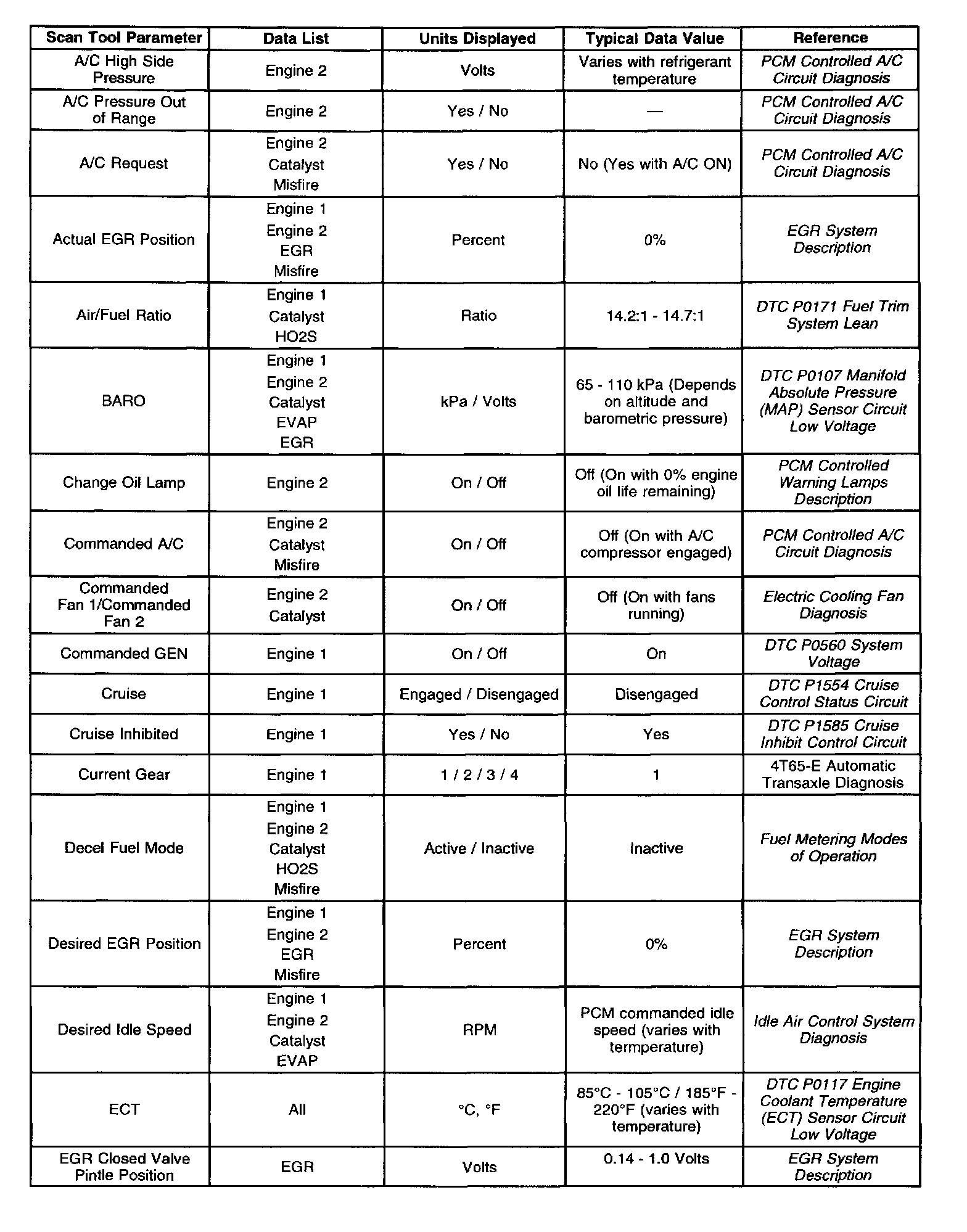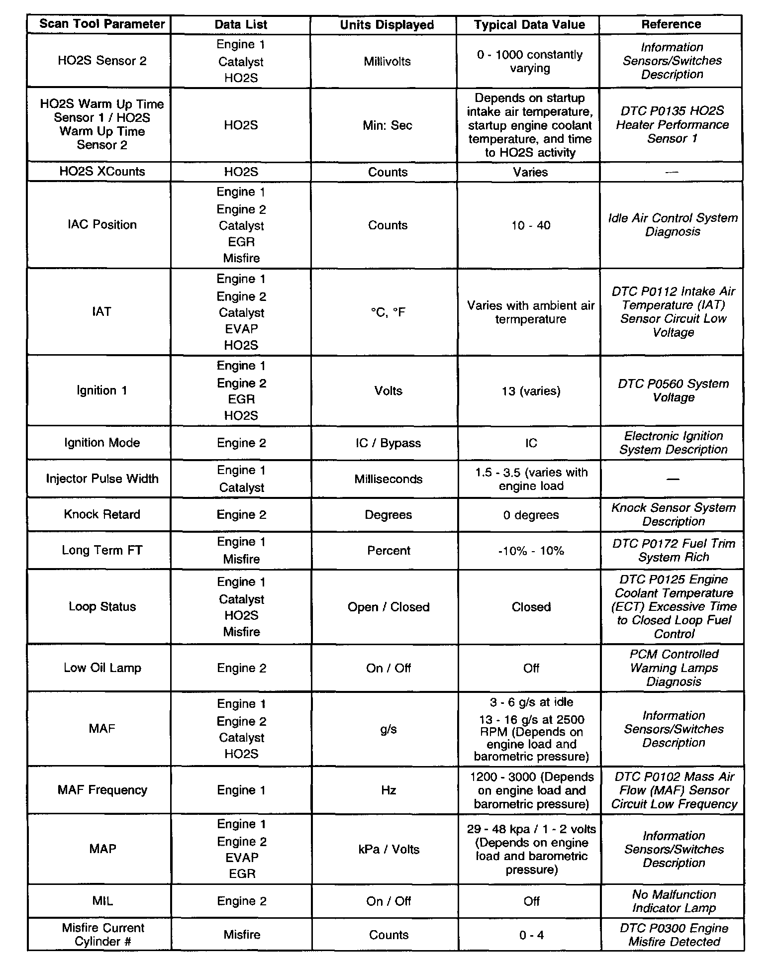 Use the Typical Scan Data Values table only after the Powertrain On-Board Diagnostic System Check has been completed, no DTCs were noted and you have determined the on-board diagnostics are functioning properly. Scan tool values from a properly running engine may be used for comparison with the engine you are diagnosing. The Typical Scan Data values represent values that would be seen on a normally running engine.