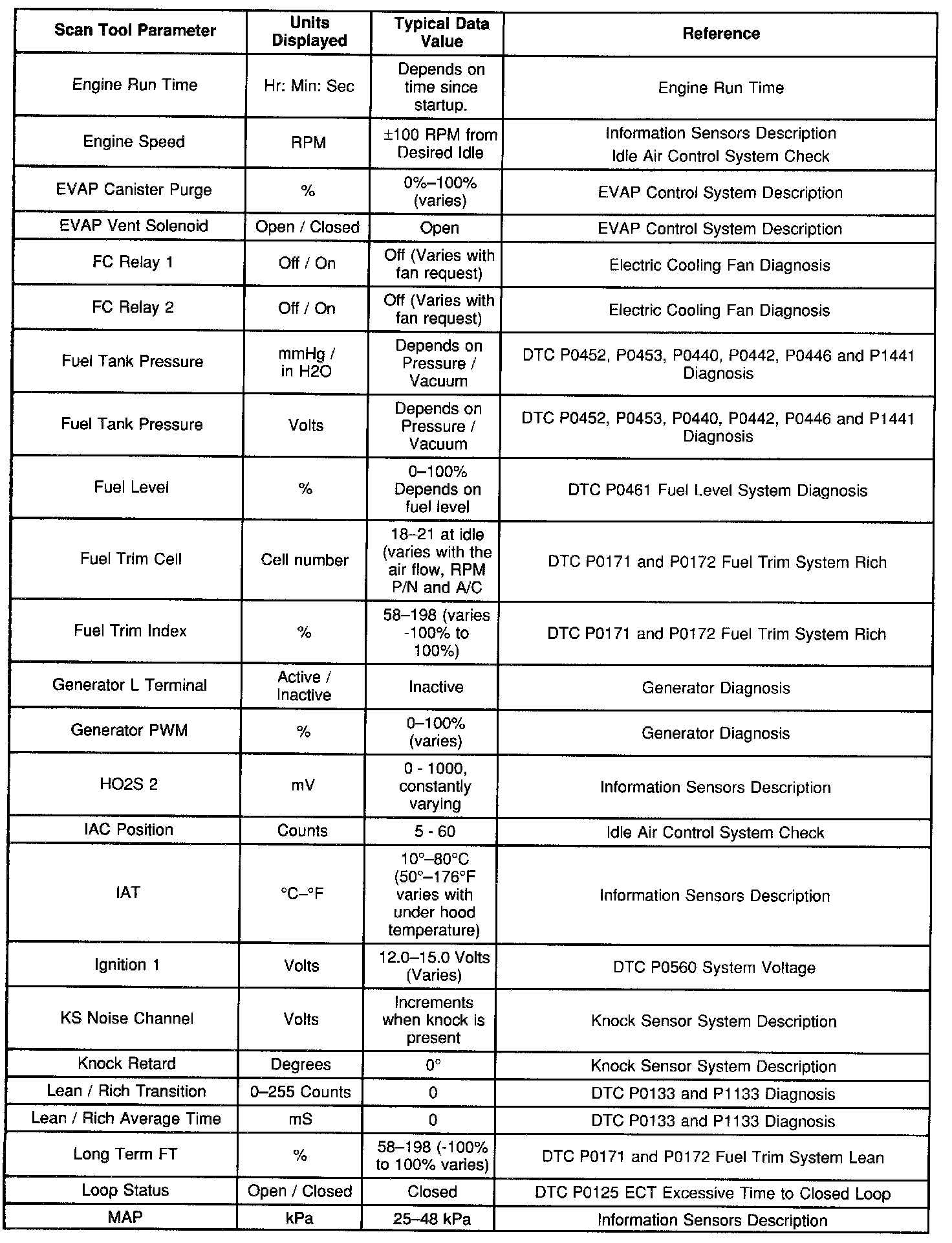 NOTE: Do not use a scan tool that displays faulty data. Report the scan tool problem to the manufacturer. Use of a faulty scan tool can result in misdiagnosis and unnecessary parts replacement. Only the parameters listed below are used in this manual for diagnosis. If a scan tool reads other parameters, General Motors does not recommend these values for use in the diagnosis. For more description on the values and use of the scan tool to diagnose the PCM inputs, refer to the applicable diagnostics. If all of the values are within the illustrated ranges, refer to Symptoms.