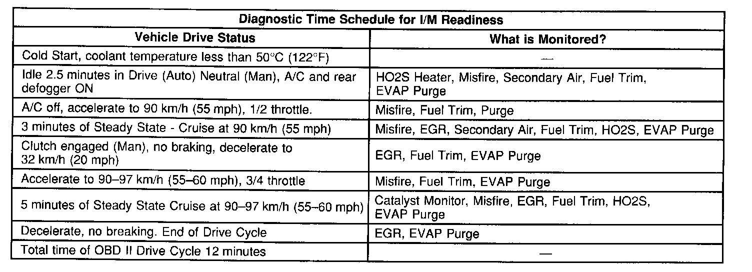 IMPORTANT: The System Status display indicates only whether or not the test has been completed. The System Status display does not necessarily mean that the test has passed. If a Failed Last Test indication is present for a DTC associated with one of the above systems, that test is failed; diagnosis and repair is necessary in order to meet the I/M 240 requirement. Verify that the vehicle passes all of the diagnostic tests associated with the displayed System Status' prior to returning the vehicle to the customer. Refer to the Typical OBD II Drive Cycle table (more than one drive cycle may be needed) to use as a guide to complete the I/M 240 System Status tests.