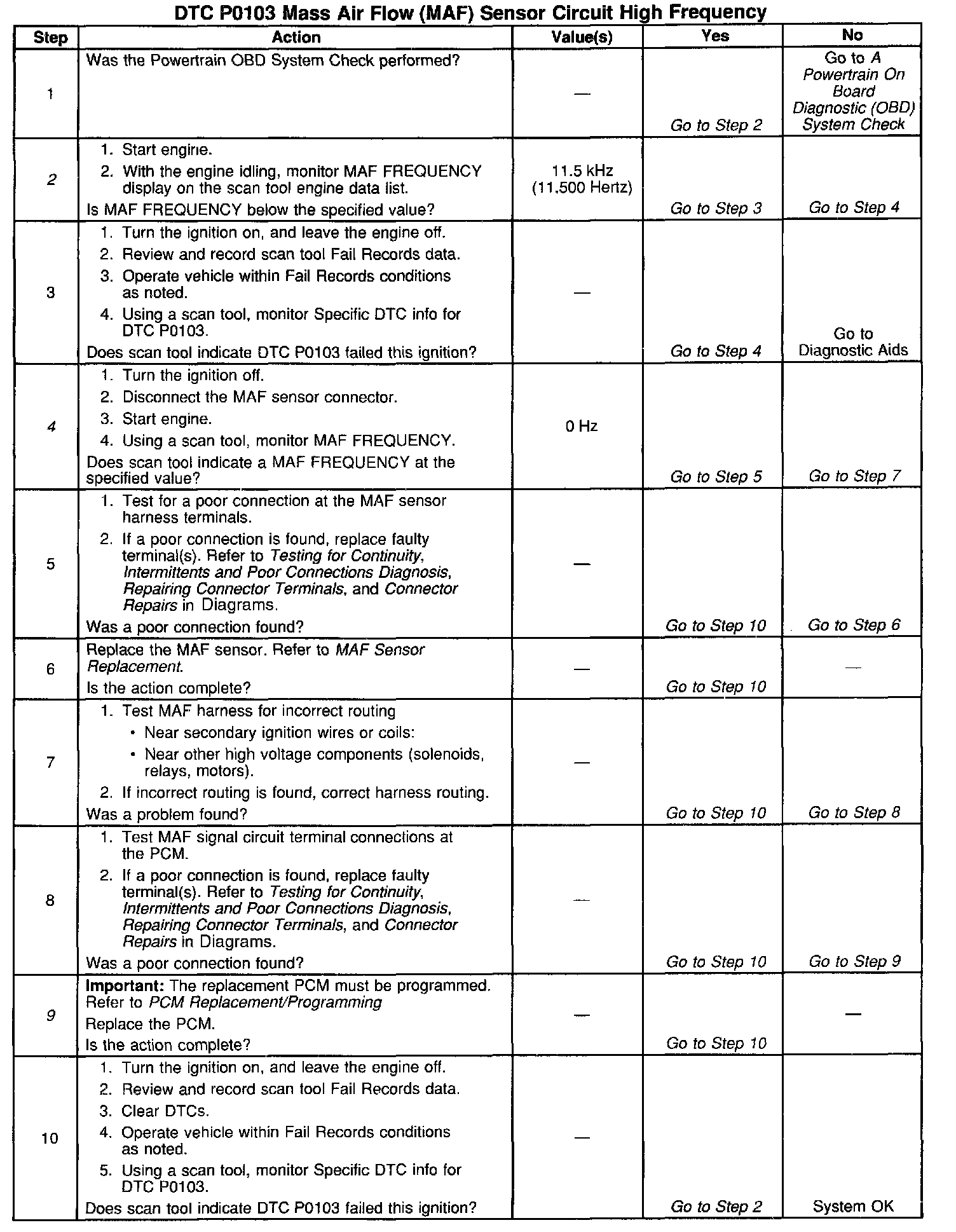 The MAF sensor produces a frequency signal which can be monitored using a scan tool. The frequency will vary within a range of around 2000 Hertz at idle to near 8,000 Hertz at maximum engine load. DTC P0103 will be set if the signal from the MAF sensor is above the possible range of a normally operating MAF sensor.