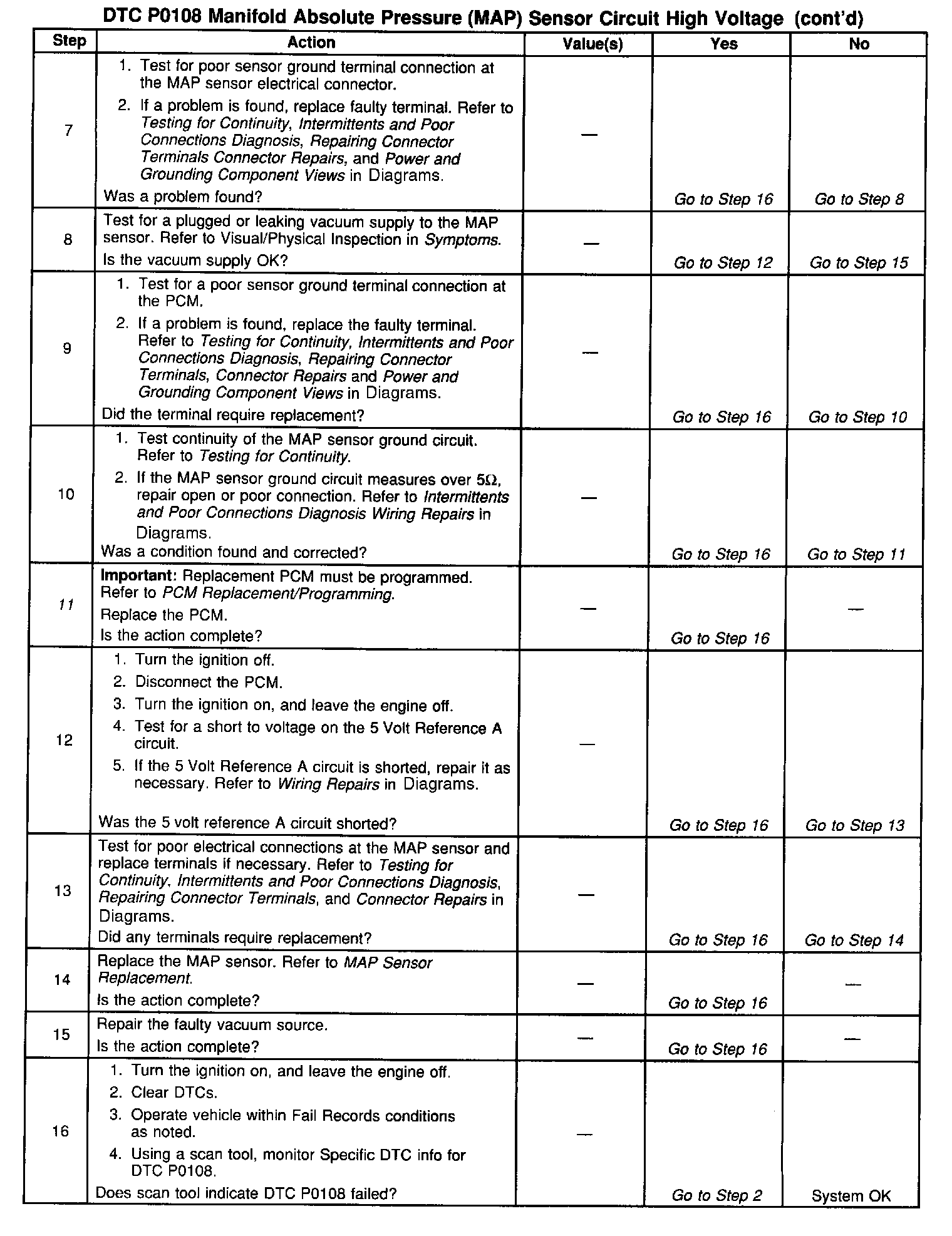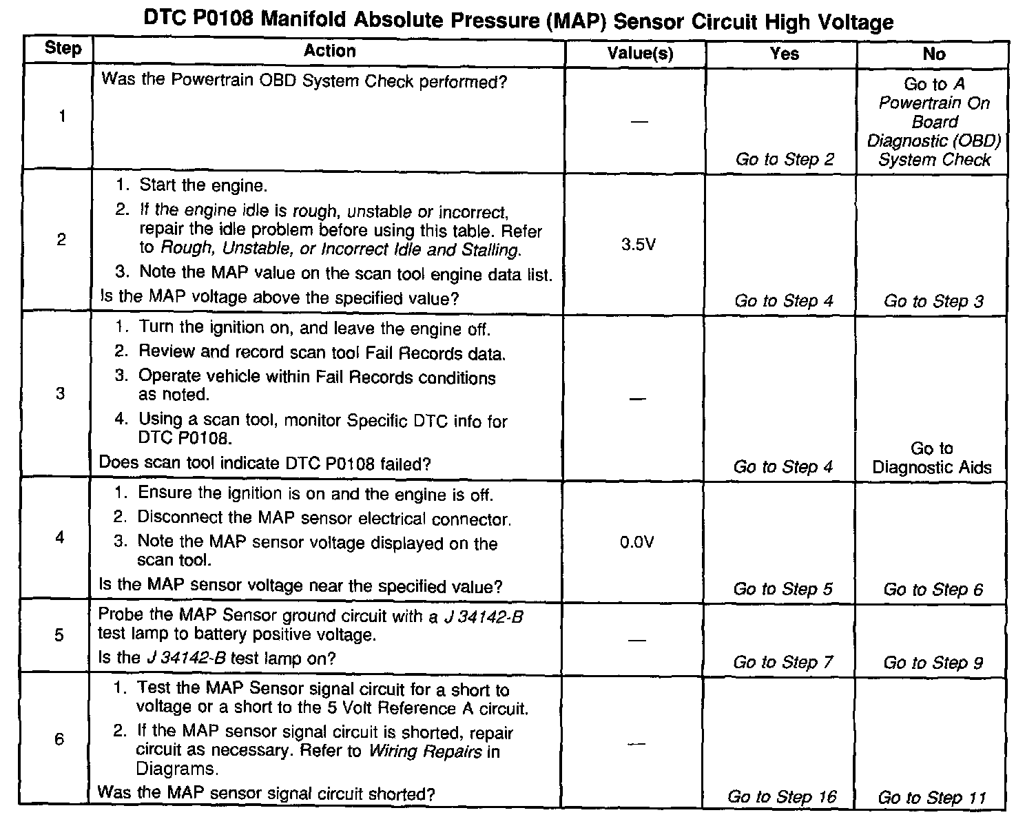 If DTC P0108 cannot be duplicated, the information included in the Fail Records data can be useful in determining the conditions that caused this DTC to set. If it is determined that the DTC occurs intermittently, performing the DTC P1106 Manifold Absolute Pressure (MAP) Sensor Circuit Intermittent High Voltage table may isolate the cause of the fault.