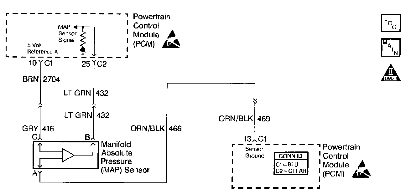 ^ Damaged harness. Inspect the wiring harness for damage. If the harness appears to be OK, observe the MAP display on the scan tool while moving connectors and wiring harnesses related to the sensor. A change in the display will indicate the location of the fault.Symptom Related Diagnostic Procedures