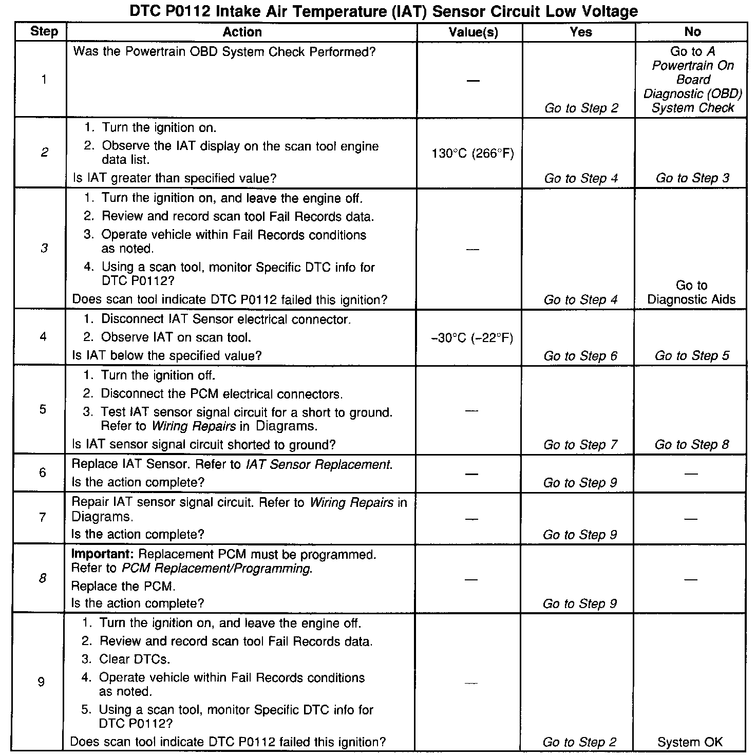 3. If DTC P0112 can be repeated only by duplicating the Fail Records conditions. The table may be used to test the IAT sensor at various temperatures to evaluate the possibility of a shifted sensor that may be shorted above or below a certain temperature. If this is the case, replace the IAT sensor. If the IAT sensor appears to be OK, the fault is intermittent refer to Diagnostic Aids.