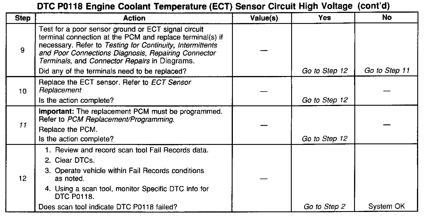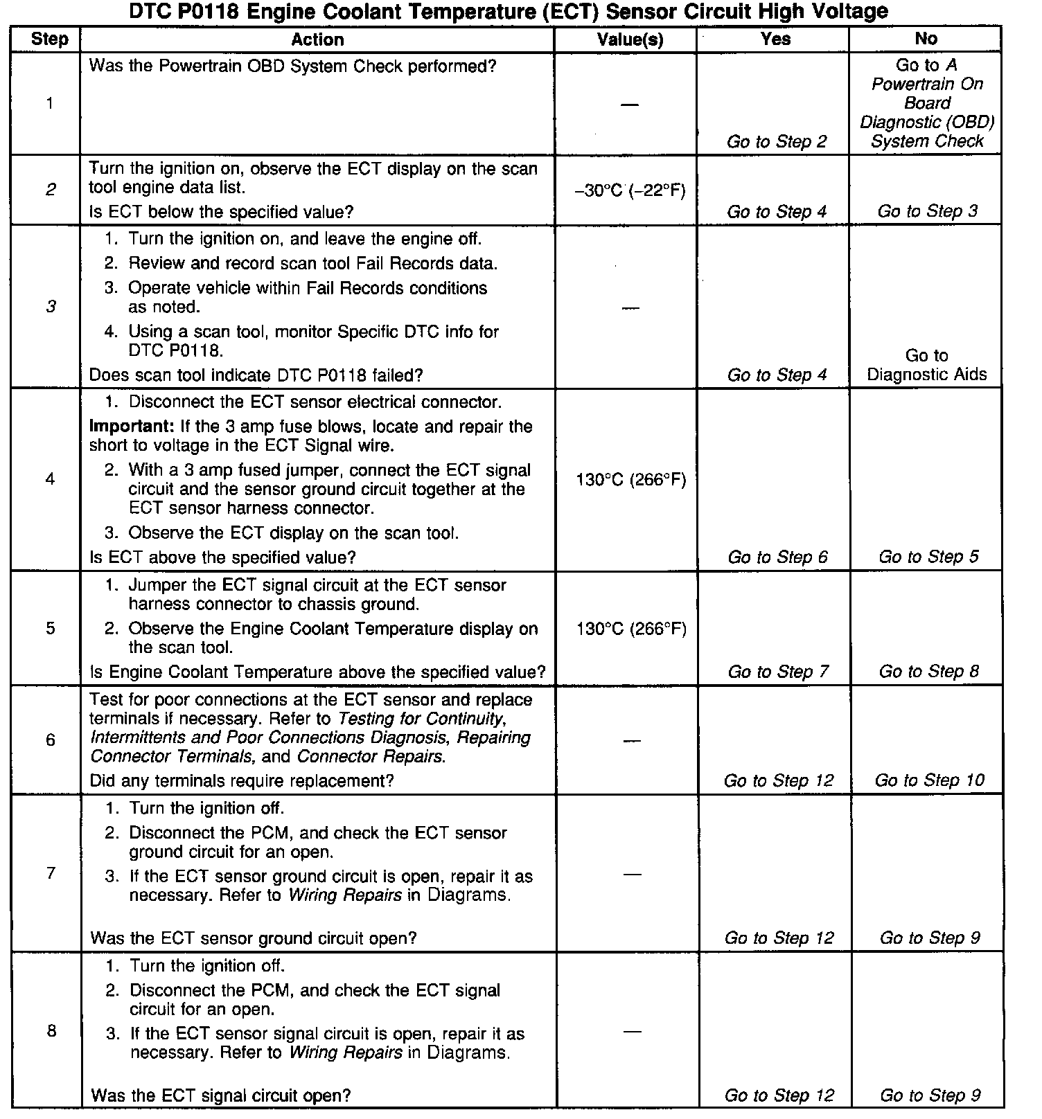 3. If DTC P0118 can be repeated only by duplicating the Fail Records conditions. The table may be used to test the ECT sensor at various temperatures to evaluate the possibility of a shifted sensor that may be shorted above or below a certain temperature. If this is the case, replace the ECT sensor. If the ECT sensor appears to be OK, the fault is intermittent refer to Diagnostic Aids.