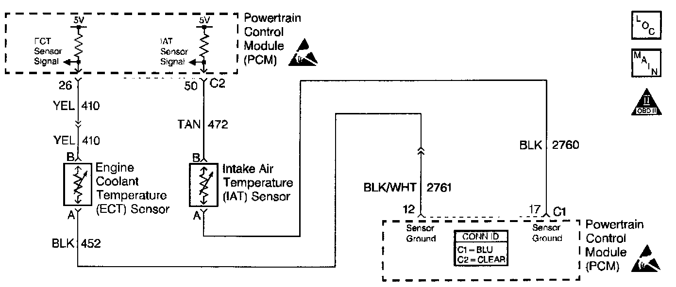 The Engine Coolant Temperature (ECT) sensor is a thermistor mounted in the engine coolant stream. The PCM applies a voltage (about 5.0V) through a pull up resistor to the ECT signal circuit. When the engine coolant is cold, the sensor (thermistor) resistance is high, therefore the PCM will measure a high signal voltage. As the engine coolant warms, the sensor resistance becomes less, and the ECT signal voltage measured at the PCM drops. With a fully warmed up engine, the ECT signal voltage should measure about 1.5 to 2.0V.