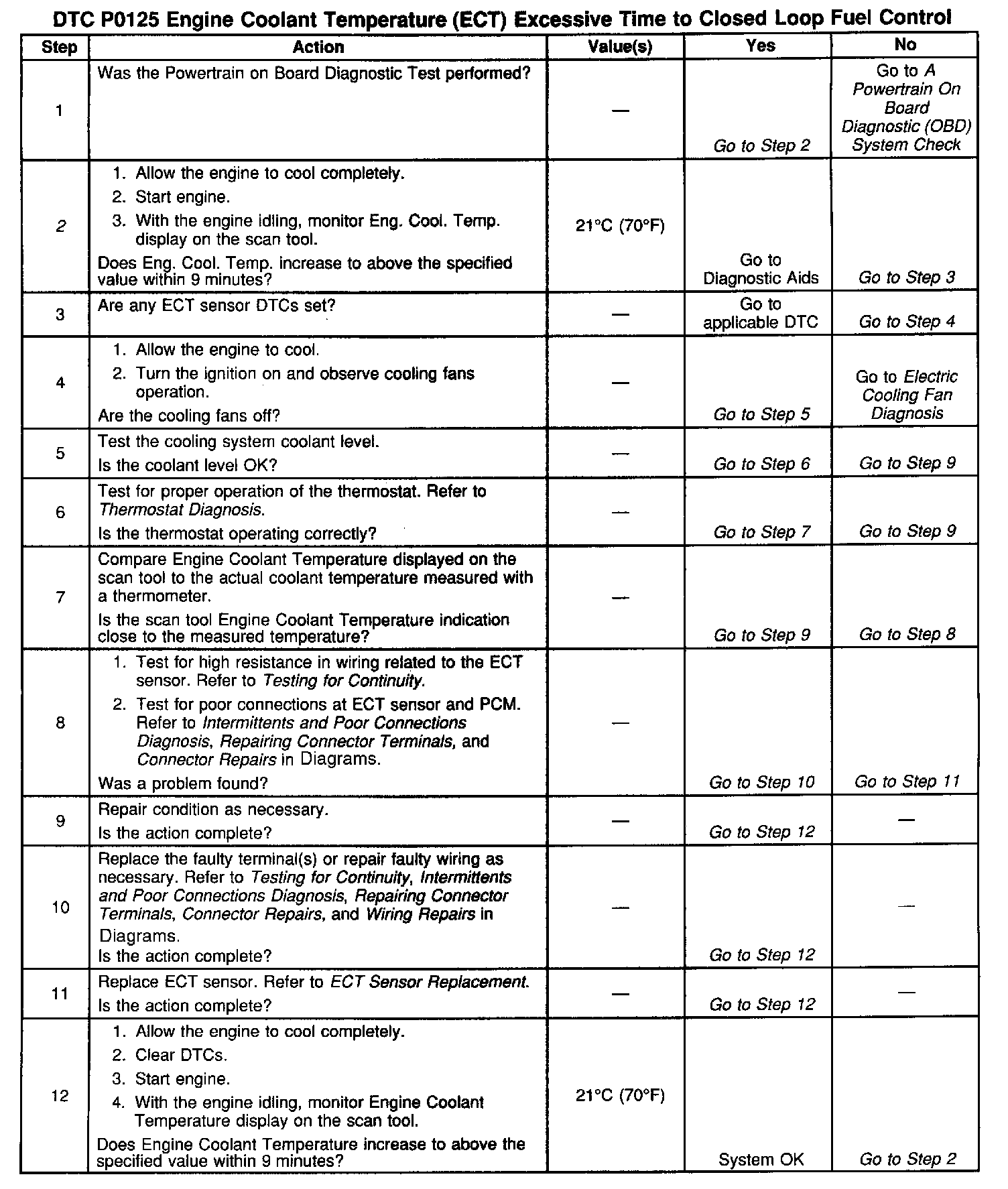 DTC P0125 set indicates a skewed ECT sensor. Comparing the Engine Coolant Temperature displayed on a scan tool with actual coolant temperature measured with a thermometer may isolate this condition. If the displayed Engine Coolant Temperature is not close to the actual coolant temperature, replace the ECT sensor. Refer to ECT Sensor Replacement.
