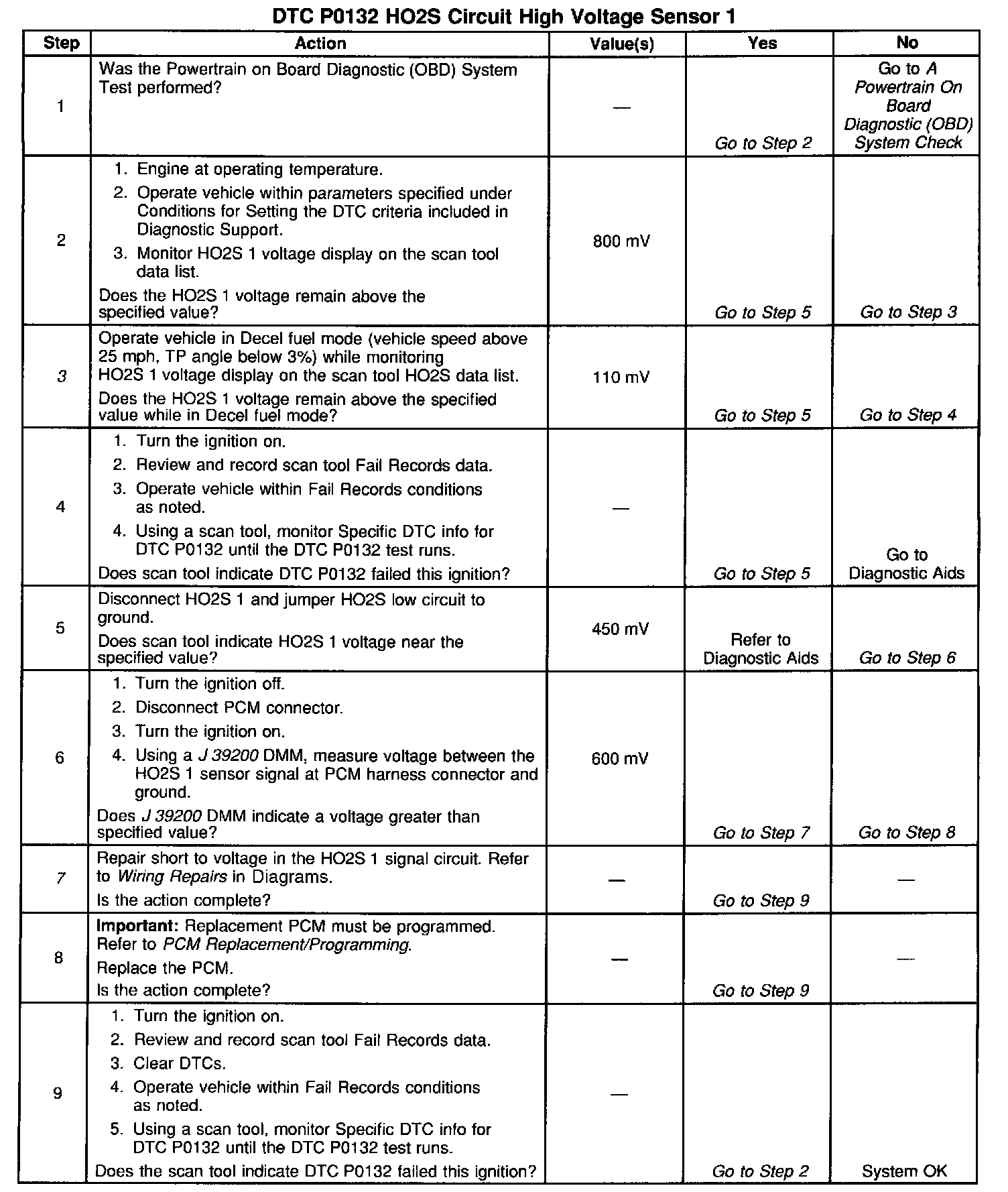 3. DTC P0132 failing during deceleration fuel mode operation may indicate a condition described in the Diagnostic Aids above. If the DTC P0132 test passes while the Fail Records conditions are being duplicated, an intermittent condition is indicated. Reviewing the Fail Records vehicle mileage since the diagnostic test last failed may help determine how often the condition that caused the DTC to be set occurs. This may assist in diagnosing the condition.