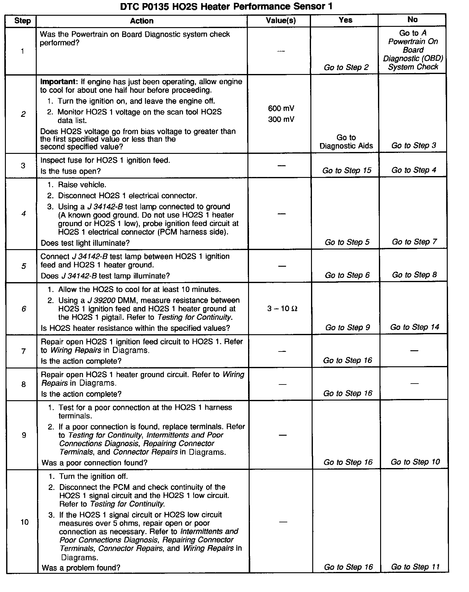 The PCM will run the heater test only after a cold start (determined by engine coolant and Intake Air Temperature at the time of start-up) and only once during an ignition cycle. When the engine is started the PCM will monitor the HO2S voltage. When the HO2S voltage indicates a sufficiently active sensor, the PCM looks at how much time has elapsed since start-up. If the PCM determines that too much time was required for the HO2S 1 to become active, a DTC P0135 will set. The time it should take the HO2S to reach operating temperature is based on the Engine Coolant Temperature at start up and the average Mass Air Flow since start-up (higher average airflow or higher start-up Engine Coolant Temperature = shorter time to HO2S activity).