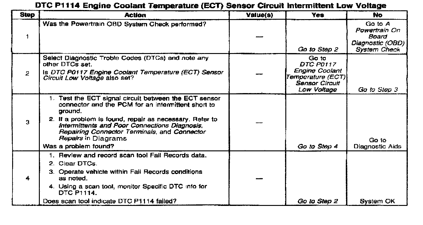 The Engine Coolant Temperature (ECT) sensor is a thermistor mounted in the engine coolant stream. The PCM applies a voltage (about 5.0 volts) through a pull up resistor to the ECT signal circuit. When the engine coolant is cold, the sensor (thermistor) resistance is high therefore the PCM will measure a high signal voltage. As the engine coolant warms, the sensor resistance becomes less, and the ECT signal voltage measured at the PCM drops. With a fully warmed up engine, the ECT signal voltage should measure about 1.5 to 2.0 volts. If the PCM detects an ECT signal that is intermittently below the range of the ECT sensor, DTC P1114 will set.