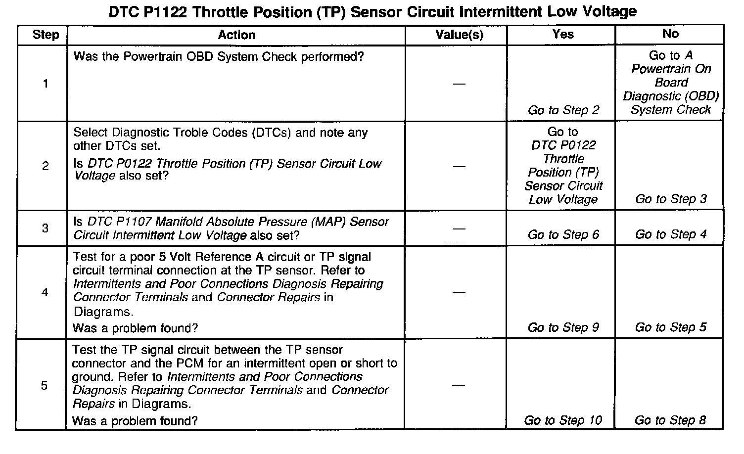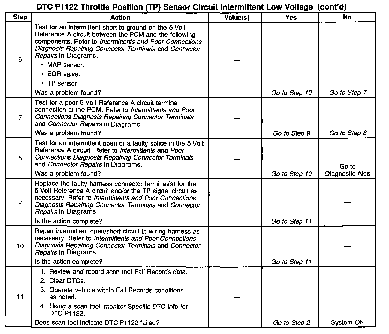 The TP signal is one of the most important inputs used by the PCM for fuel control and most of the PCM-controlled outputs. If the PCM detects a TP signal that is intermittently below the range of the TP sensor, DTC P1122 will be set.