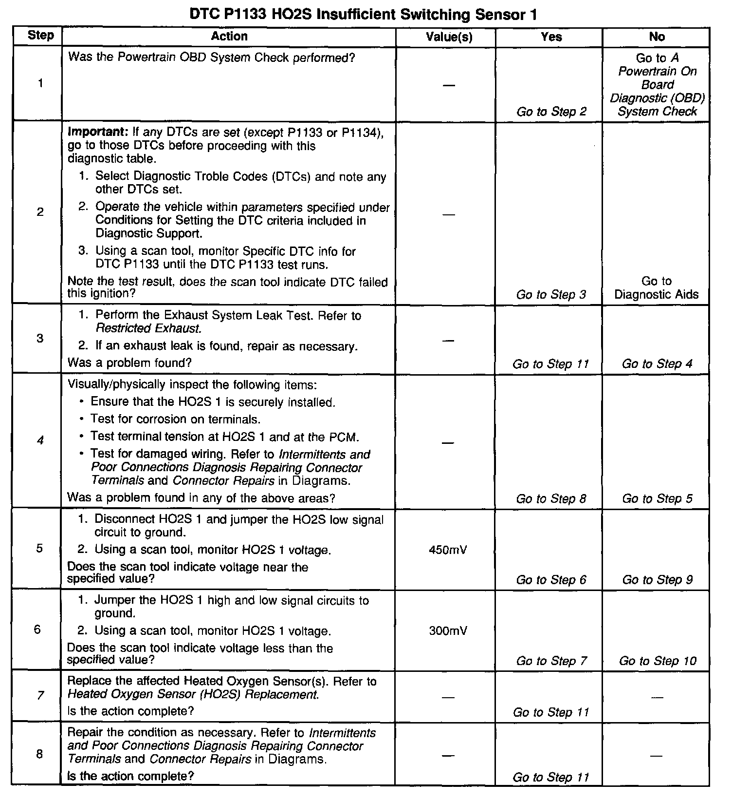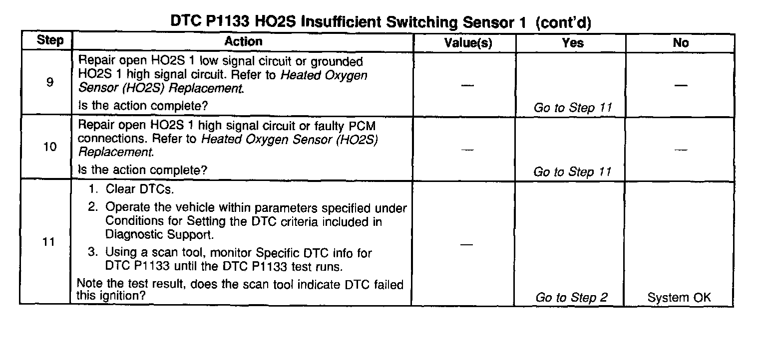 A malfunction in the HO2S heater ignition feed or ground circuit may cause a DTC P1133 to set. Check HO2S heater circuitry for intermittent faults or poor connections. If connections and wiring are OK and DTC P1133 continues to set, replace the HO2S 1.