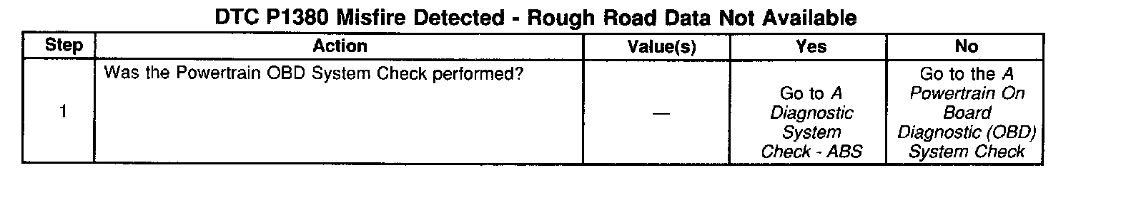 The PCM uses the rough road information to enhance the misfire diagnostic by distinguishing crankshaft speed variations caused by driving on rough road surfaces from variations caused by true misfires. The EBCM transmits rough road information based on inputs from the wheel speed sensors. If the EBCM detects a condition which will not allow it to properly identify rough road situations while a misfire condition is being detected by the PCM, DTC P1380 will be set.