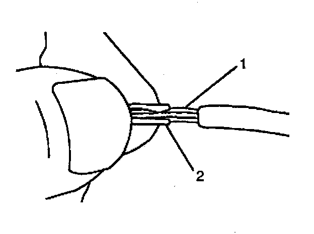 7. Center the splice clip (2) over the stripped wires (1) and hold the clip in place.