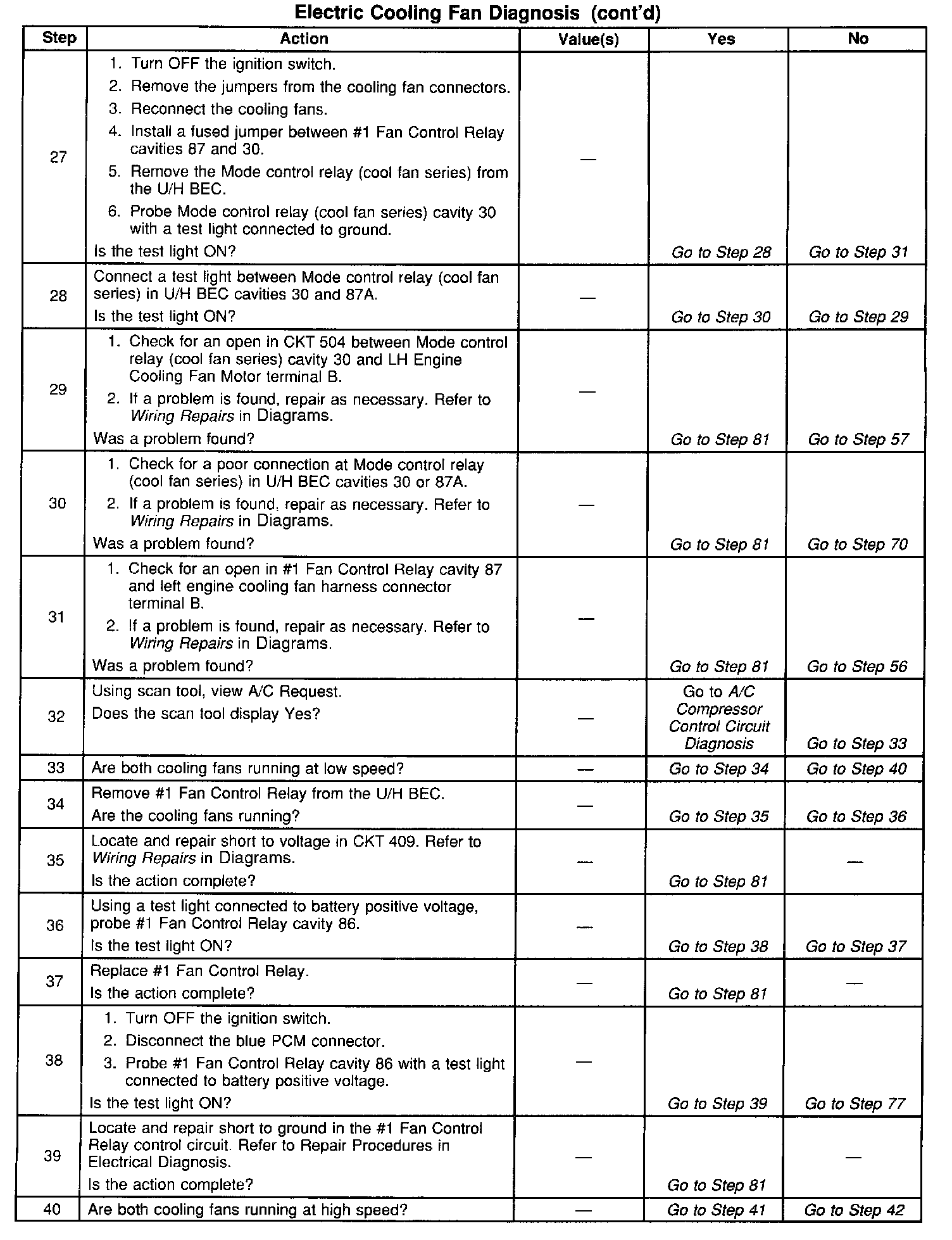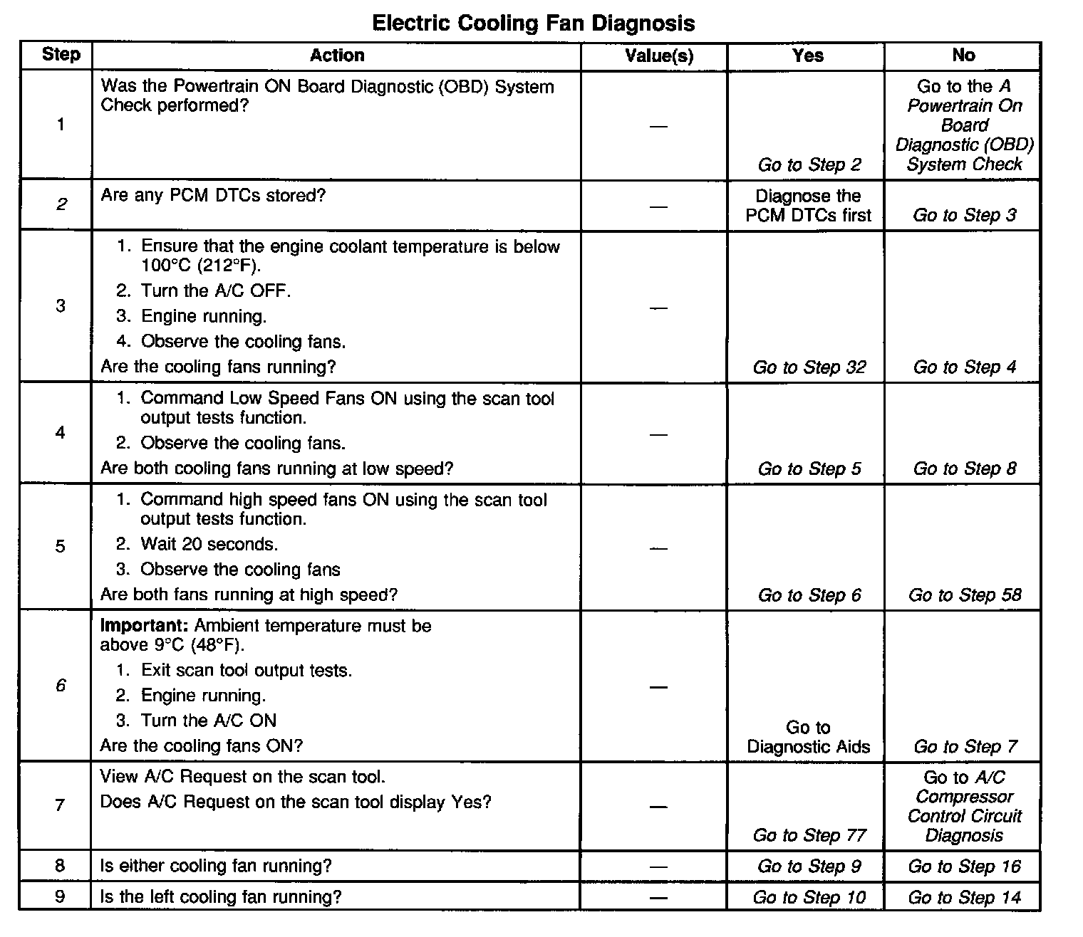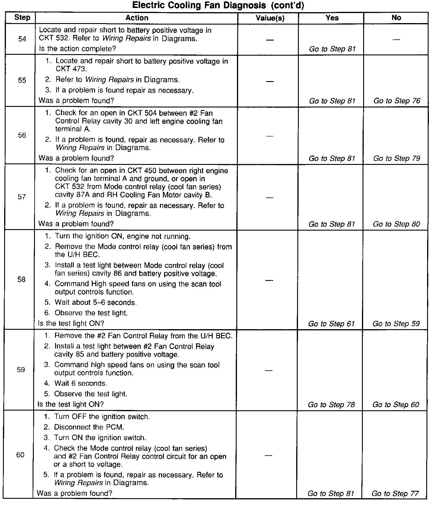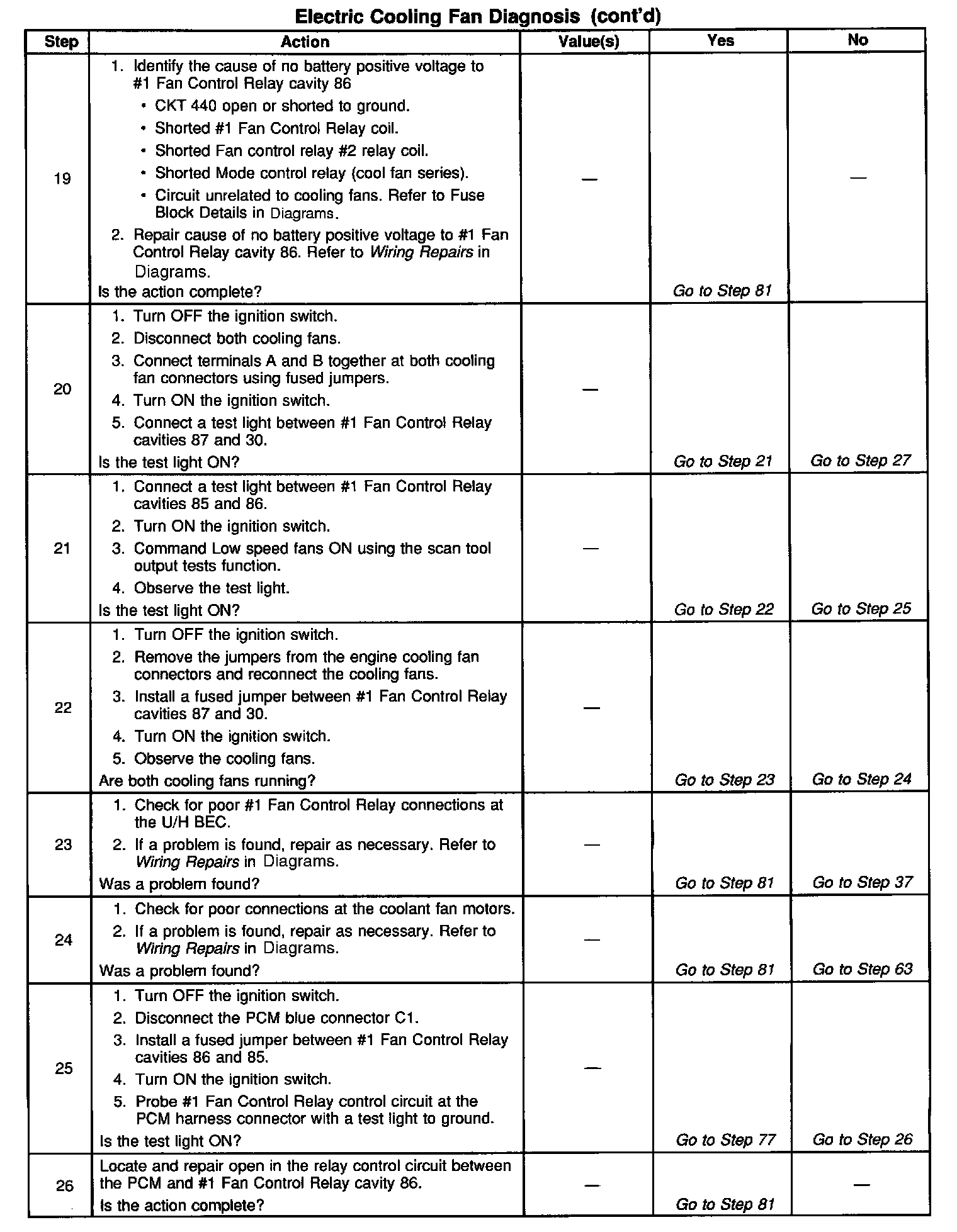 2. Stored diagnostic trouble codes may affect engine cooling fans operation. This diagnostic table may lead to improper diagnosis and replacement of good parts if diagnostic trouble codes are present.