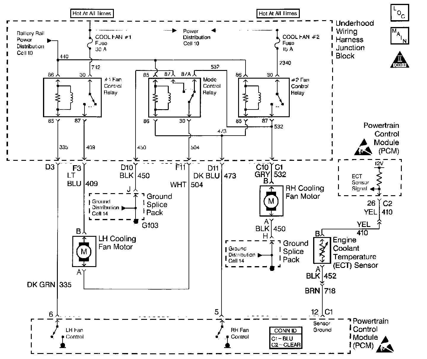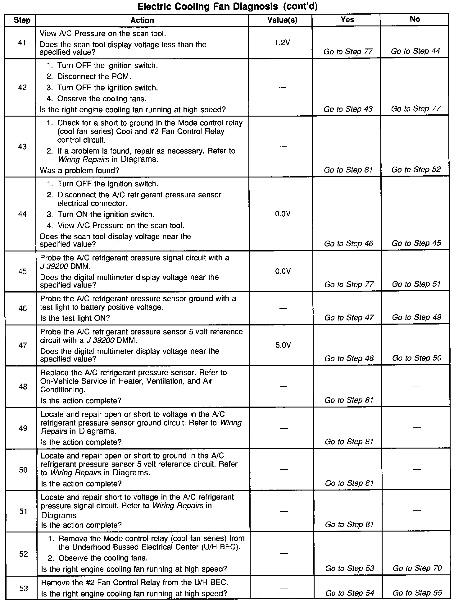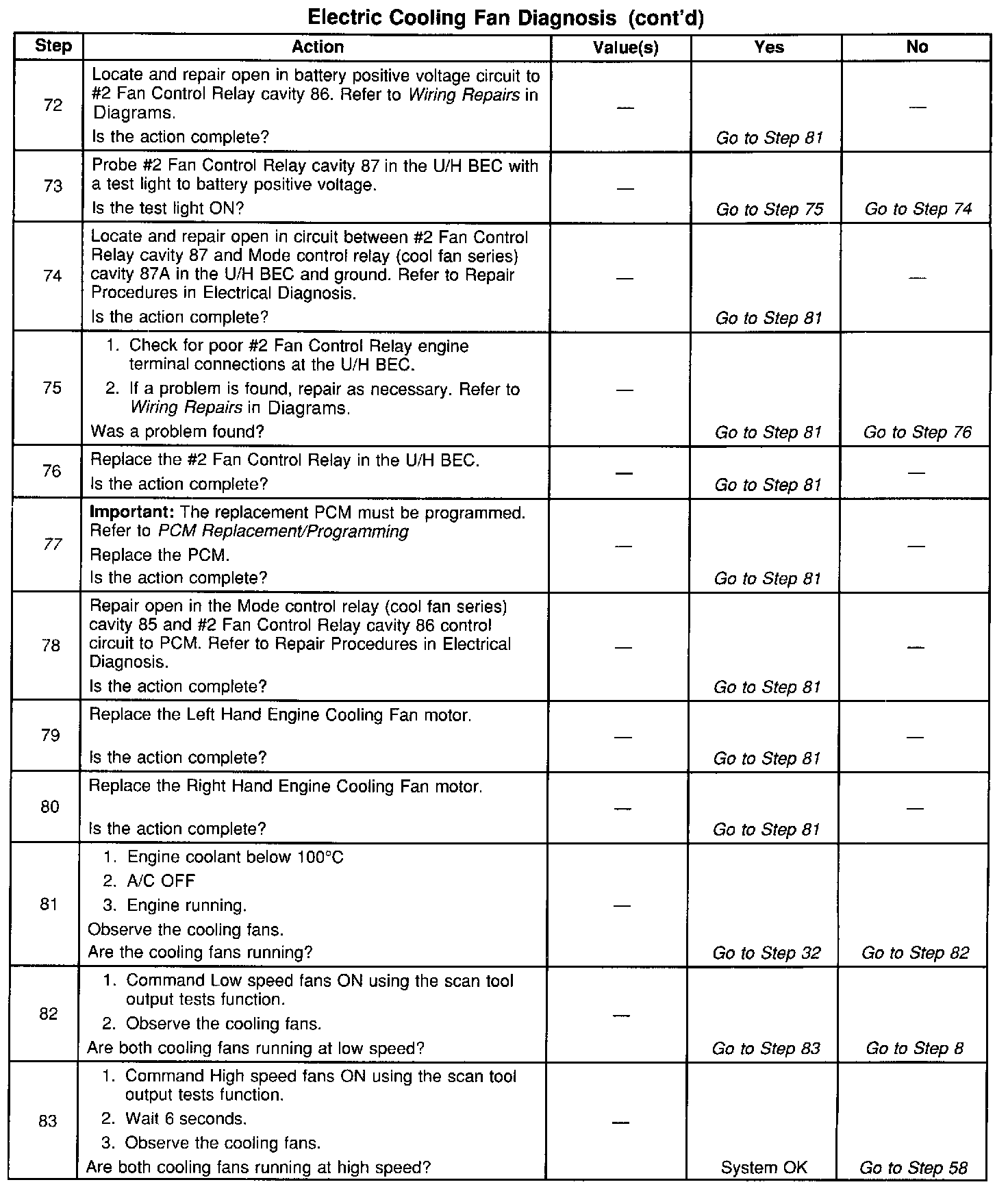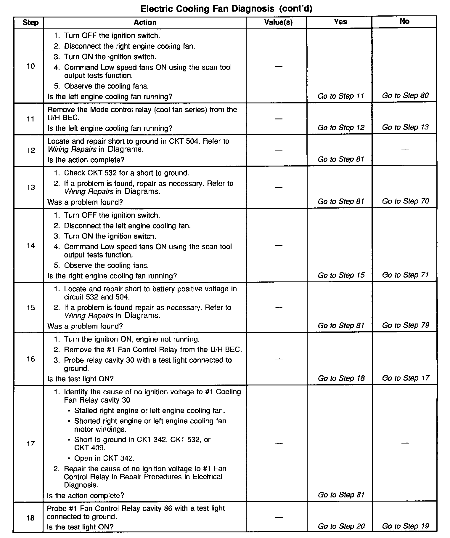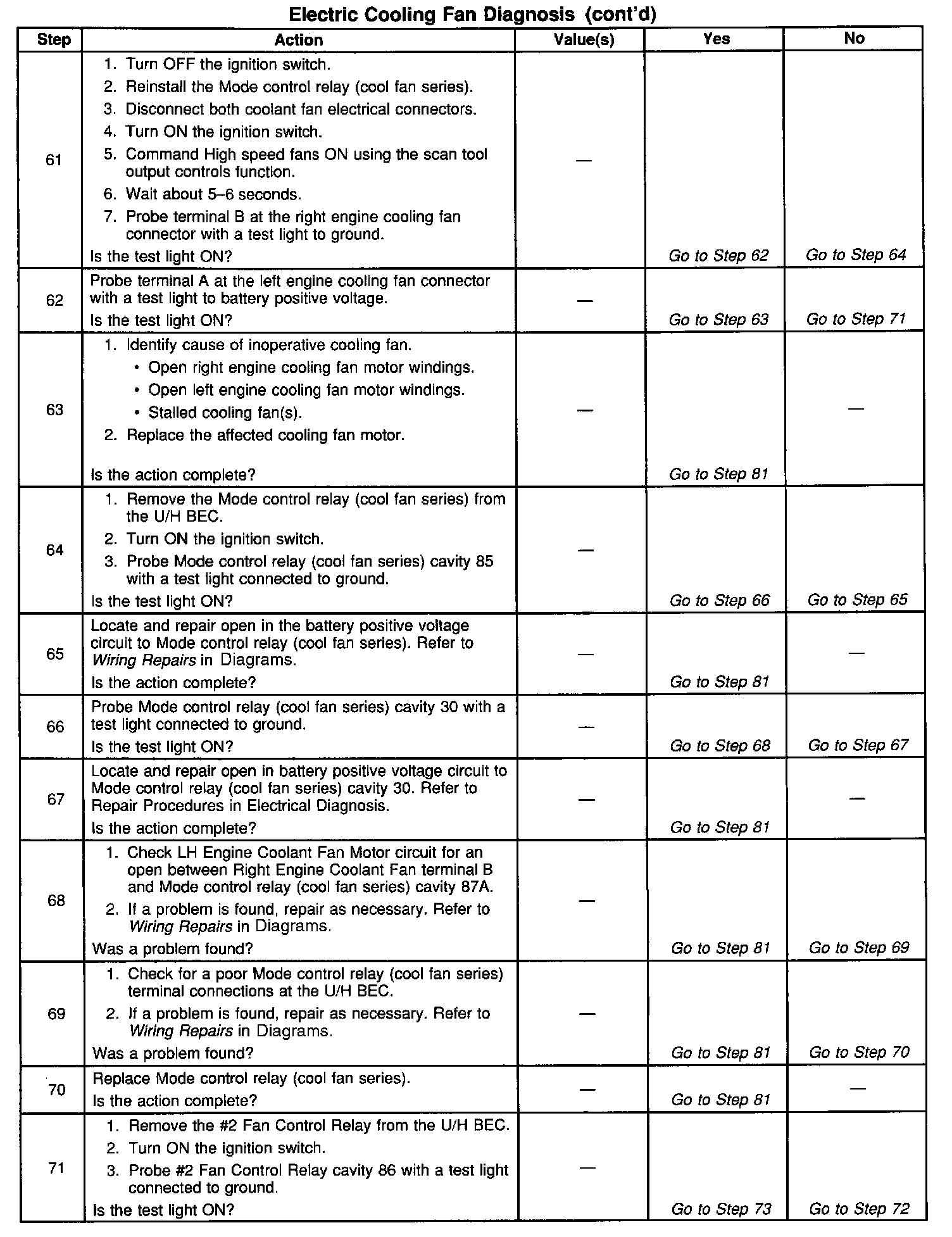 2. Stored diagnostic trouble codes may affect engine cooling fans operation. This diagnostic table may lead to improper diagnosis and replacement of good parts if diagnostic trouble codes are present.