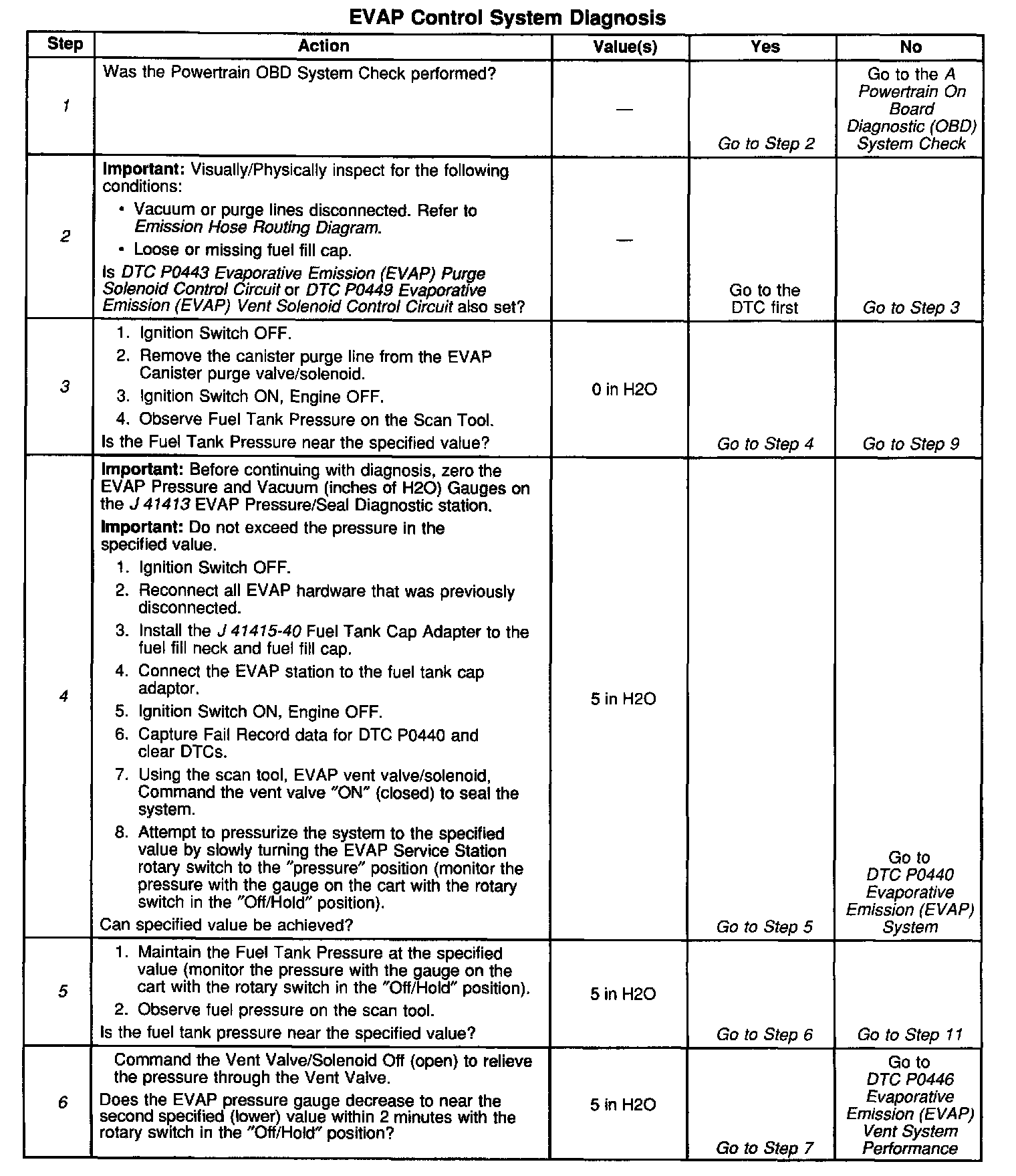 5. Verifies that the fuel tank pressure sensor accurately reacts to EVAP system pressure changes. The [1][2]EVAP station is pressurizing a sensor that normally reads vacuum. The tech II reads high pressure at 0 volts and high vacuum at 5 volts. The Tech II can only read a max pressure of 6.0 inches of H2O (0 Volts). However the EVAP Service station can pressurize the system to much higher pressures. The Scan Tool value should be within ±0.5 of the specified value.